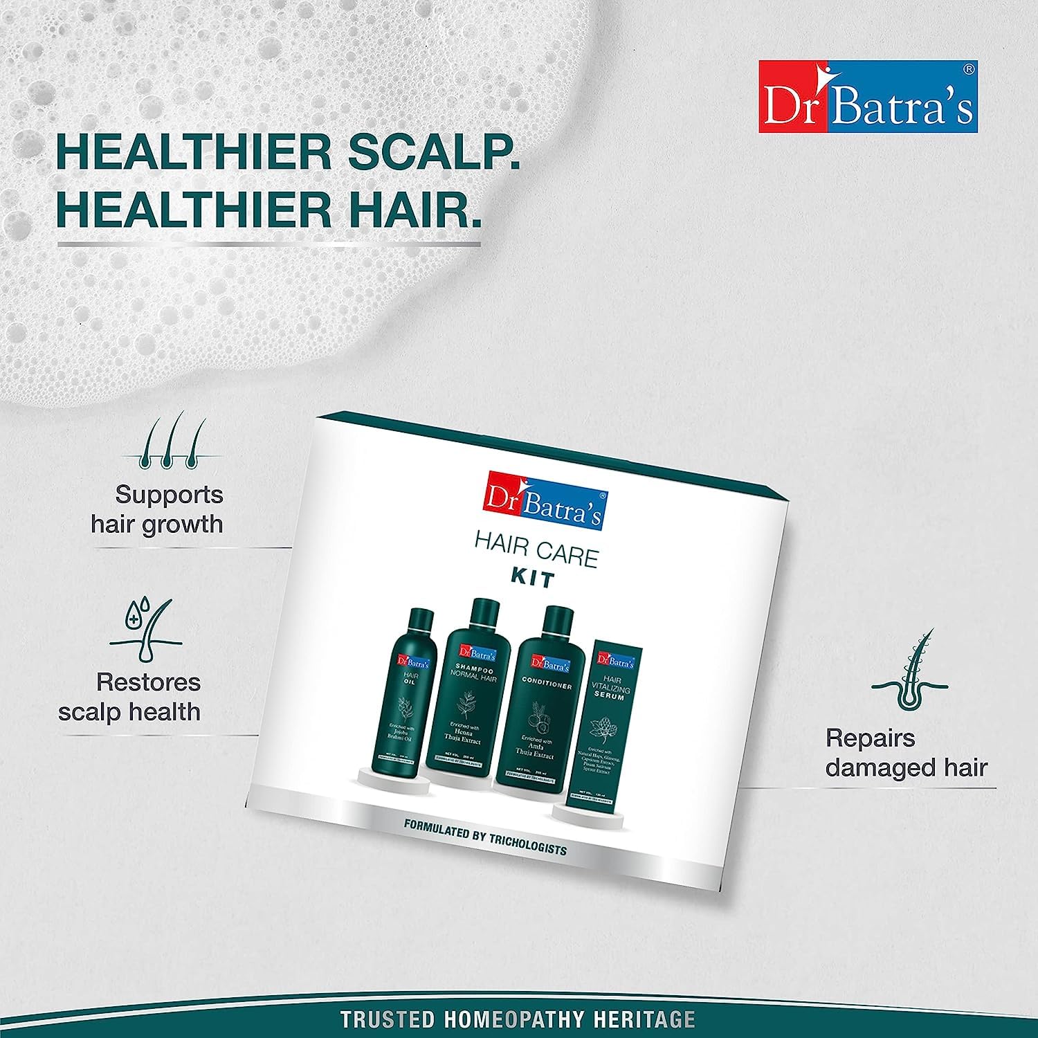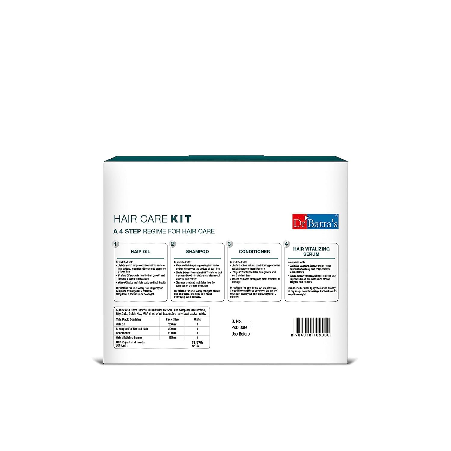 Dr Batra's range of hair care products are carefully formulated with gentle ingredients to provide stronger shinier and healthier hair. Dr Batra's Hair Kit includes hair oil shampoo conditioner and hair vitalizing serum. This 4-in-1 hair care kit is crafted to give you the perfect daily hair care regime. It helps to strengthen the hair follicles restore scalp health and improve hairâs texture while leaving hair nourished from root to tip. Elevate your daily hair care ritual with this easy to follow 4-in-1 hair care kit.