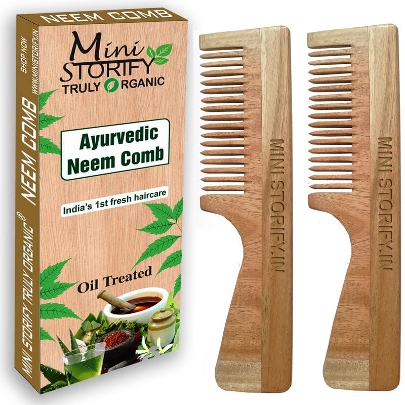 Mini Storify Truly Organic Kacchi Neem Wood Handle Combs - Pack of 2 - Handmade Wooden Combs for Women and Men