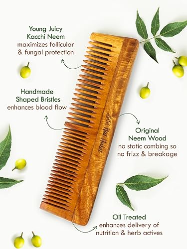 HANDMADE 100% NATURAL Dual Tooth KACCHI NEEM COMB For Multi-Action - DETANGLING FRIZZ Control & SHINE. Suited for all hair types. Benefits Young neem wood combs provide multi-faceted benefits for hair & overall health Drives hair growth & thickness Controls hair & thinning Keeps away brittleness cuticle damage & hair breakage. Kitchen fresh Hair Oil for severe hairfall and hair control. Specially made with cooling ingredients for Summer conditions. This Dasabuti oil is enriched for over 10HRS via Slow Heat Infusion of fresh hibiscus leaves neem curry leaves bel leaves brahmi tulsi amla shikakai nagarmotha flax seeds vetiver kalonji & more in multiple oils such as castor coconut & mustard. 15 Ayurvedic herbs infused for maximised results. All oils are PURE Pressed. ZERO Paraffin & Mineral Oils. ZERO chemic& .