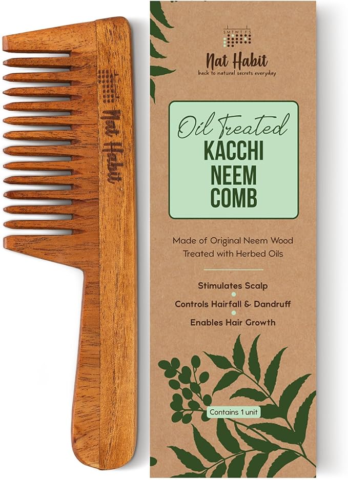 HomeHealth & PersonalHair CareNatural CombNat Habit - Back To Natural Secrets Everyday Kacchi Neem Comb, Wooden Comb For Men, Women, Treated With Neem Oil, Bhringraj & 17 Herbs (Wide Tooth) 18-20Cm Length Brown