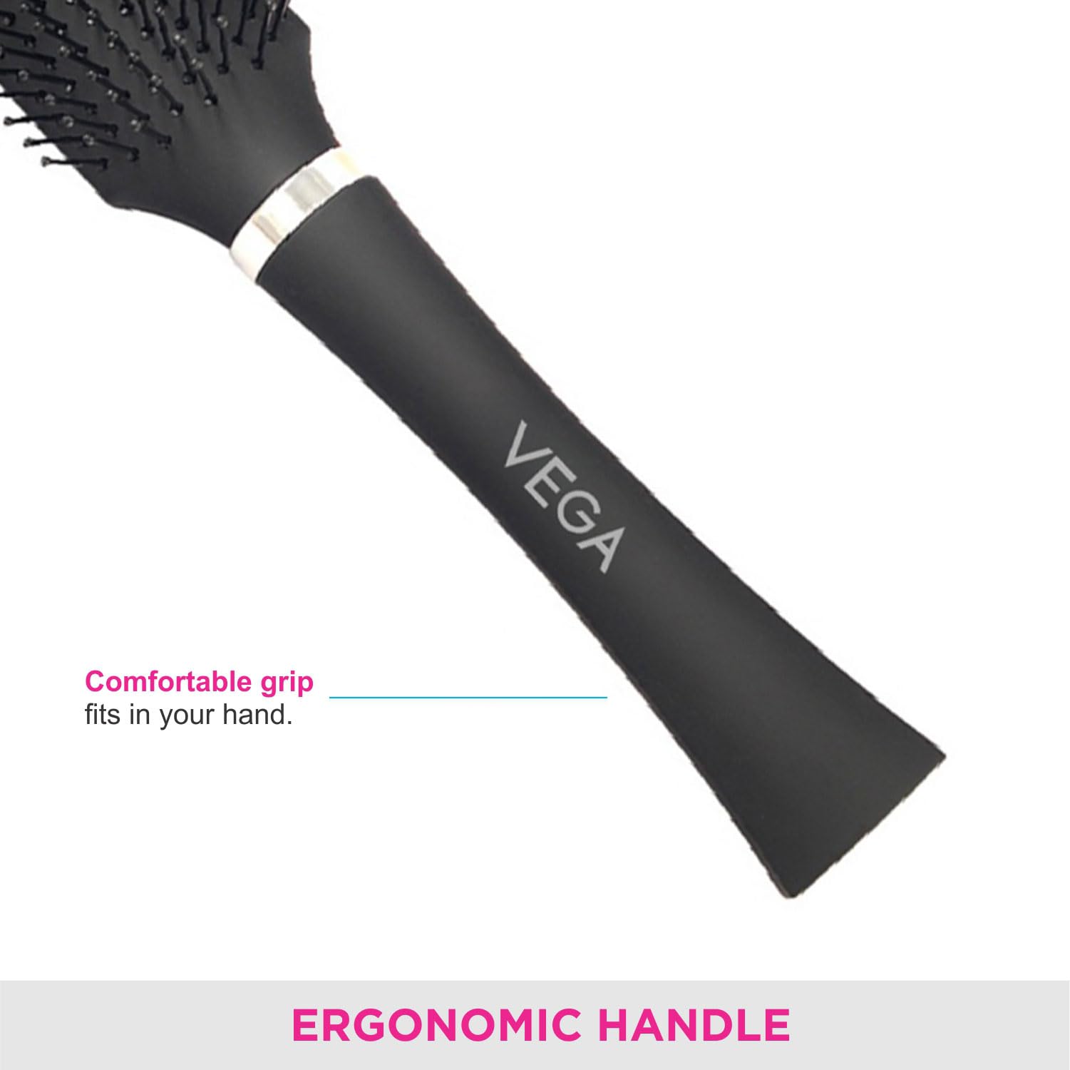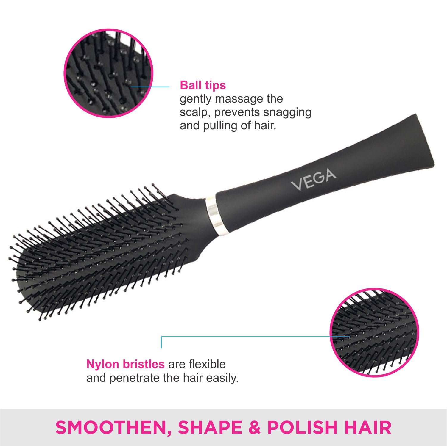 Ideal for daily styling of hair that require body and volume. These brushes are designed to smoothen shape and polish all hair lengths and textures. Ball tipped nylon bristles gently massage the scalp help in detangling and add root lift. Suitable for all hair types. Mostly available in rectangle shape.