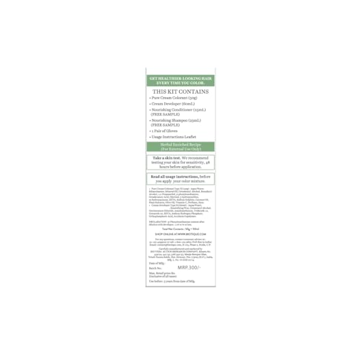 The nature and science are in complete harmony now. This innovative cream colour system blend 21st century technology with the purest pigments and most beneficial botanicals grown in the Himalayas. Discover everything you need to silken and shade your hair with healthy-looking colour and shine. This kit contains pure cream colorant (50g) cream developer (60ml) nourishing conditioner (25ml) (free sample) nourishing shampoo (25ml) (free sample) 1 pair of gloves usage instructions leaflet herbal enriched recipe (for external use only) take a skin test. We recommend testing your skin for sensitivity 48 hours before application. Organically pure & preservatives free. Dermatologist tested for safety.