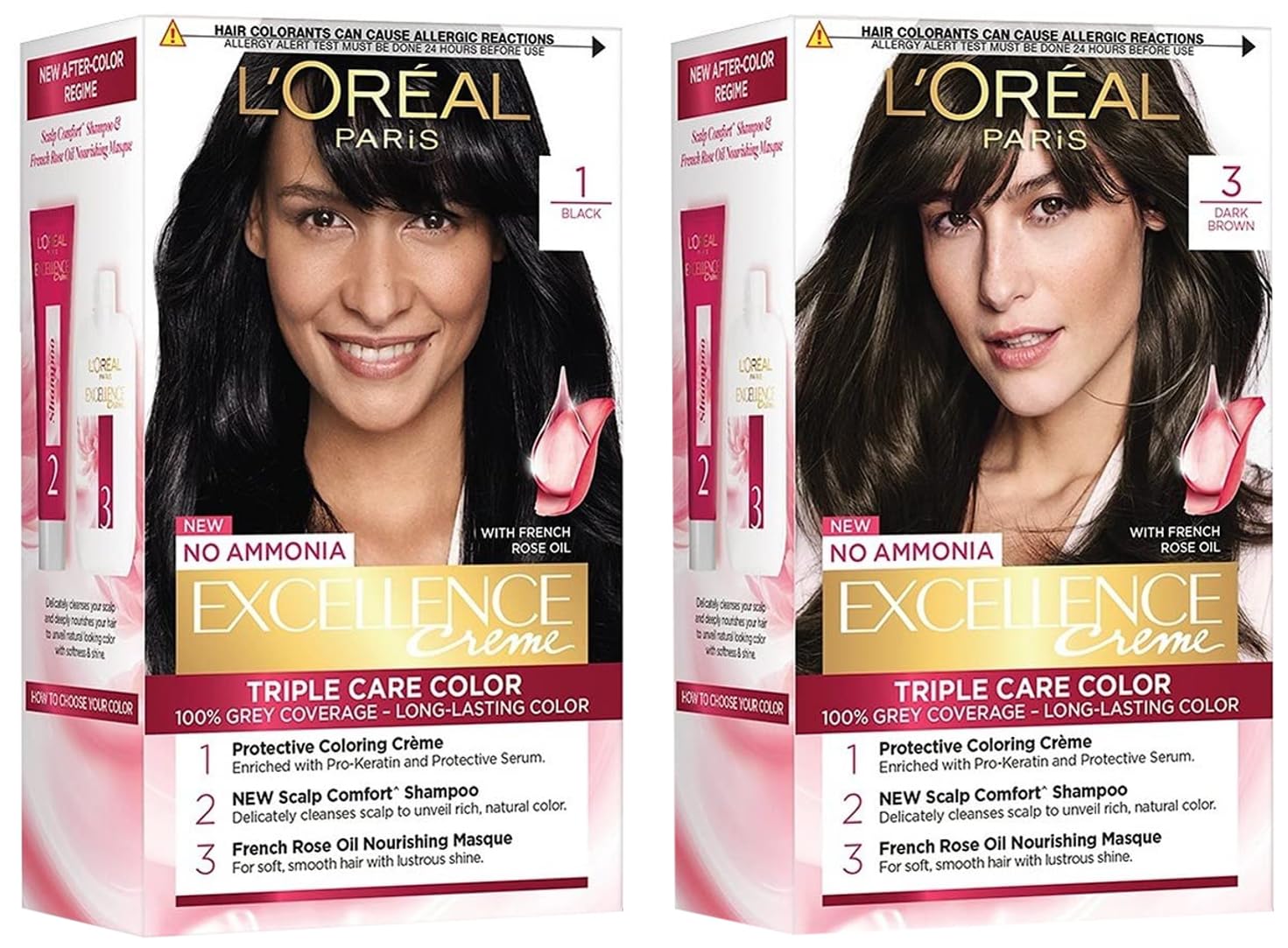 L'Oreal Paris Excellence Creme Hair Color 3 Dark Brown/Natural Darkest Brown 72ml+100gL'Oreal Paris Excellence Creme Hair Color is a triple care colour with triple care formula. 100 percent grey coverage from root to tips. Stronger hair 85 percent more resistant to brushing. For a beautifully blended colour that complements your look without a grey in sight. Rich even long lasting hair colour with a soft and silky touch. Excellence Creme hair colour triple protection means three ways to care for your hair: ceramide protects pro-keratin strengthens & collagen replenishes. In this pack you will find: the protective serum colouring creme and developer and conditioner.L'Oreal Paris Excellence Creme Hair Color 1 Black 72ml+100gL'Oreal Paris Excellence Creme Hair Color is a triple care colour with triple care formula. 100 percent grey coverage from root to tips. Stronger hair 85 percent more resistant to brushing. For a beautifully blended colour that complements your look without a grey in sight. Rich even long lasting hair colour with a soft and silky touch. Excellence Creme hair colour triple protection means three ways to care for your hair: ceramide protects pro-keratin strengthens & collagen replenishes. In this pack you will find: the protective serum colouring creme and developer and conditioner. Tips for Better results : Your colour will take better on hair that's been well prepared: always use the Pre-Colour Protective Treatment developed for fragile hair before colouring. This will help achieve even results. To enhance the look of your colour after application rinse your hair without using shampoo then apply the After-Colour Protective Conditioner.