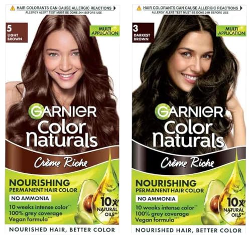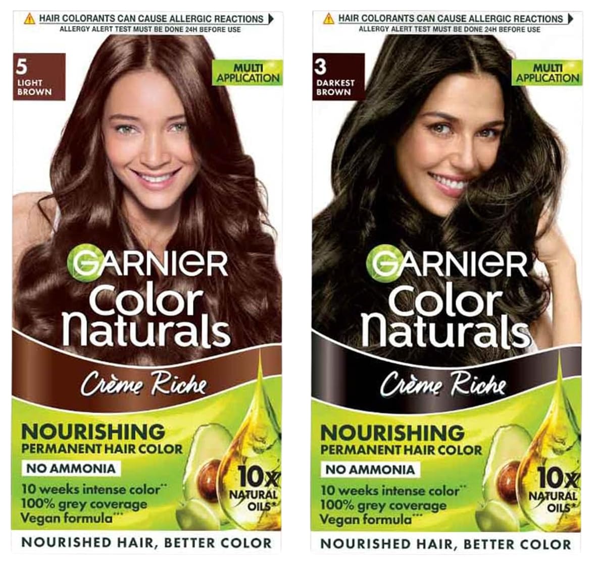 Garnier Color Naturals Cr¨me hair color Shade 3 Darkest Brown 70ml, + 60gGarnier Color Naturals is cr¨me hair colour which gives 100% Grey Coverage and beautiful rich color. It is an ammonia free hair color and has a superior Colour Lock technology which gives you rich long lasting color that lasts upto 8 weeks. Color Naturals comes in a range of 8 gorgeous shades especially suited for Indian skin tones. It is available in an easy to use kit which can be used at your convenience in the comfort of your house! It is enriched with the goodness of 3 oils â Almond Olive and Avocado which nourishes hair and provides shiny long lasting colour. Your Hair will love the nourishment and you will love the colour! To use mix equal parts of the colorant and the developer in a plastic or a glass bowl and apply the mixture to your hair with a brush on dry unwashed hair. Leave on for 30 minutes and rinse with water. Apply post colour-care conditioner (provided in kit) to the hair and rinse to reveal shiny rich hair color. Post Colour Care: We recommend using a colour protect shampoo and conditioner for long lasting colour. Note: Always do a skin allergy test 24 hours before use.Garnier Color Naturals Cr¨me hair color Shade 5 Light Brown 70ml, + 60gGarnier Color Naturals is cr¨me hair colour which gives 100% Grey Coverage and beautiful rich color. It is an ammonia free hair color and has a superior Colour Lock technology which gives you rich long lasting color that lasts upto 8 weeks. Color Naturals comes in a range of 8 gorgeous shades especially suited for Indian skin tones. It is available in an easy to use kit which can be used at your convenience in the comfort of your house! It is enriched with the goodness of 3 oils â Almond Olive and Avocado which nourishes hair and provides shiny long lasting colour. Your Hair will love the nourishment and you will love the colour! To use mix equal parts of the colorant and the developer in a plastic or a glass bowl and apply the mixture to your hair with a brush on dry unwashed hair. Leave on for 30 minutes and rinse with water. Apply post colour-care conditioner (provided in kit) to the hair and rinse to reveal shiny rich hair color. Post Colour Care: We recommend using a colour protect shampoo and conditioner for long lasting colour. Note: Always do a skin allergy test 24 hours before use.