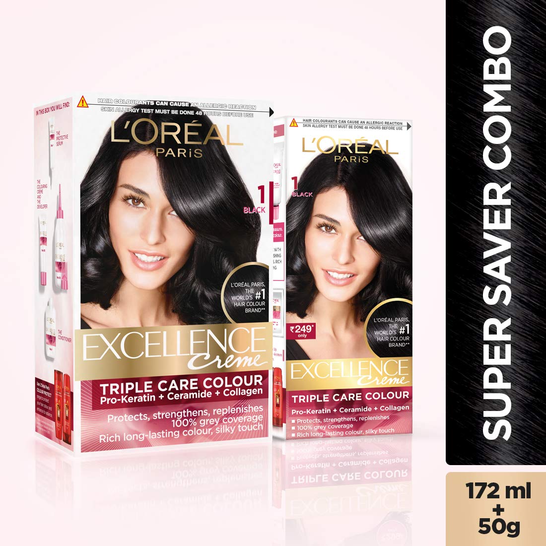 Buy this exciting combo pack. L'Oreal Paris excellence cr¨me hair colour is a triple care colour with triple care formula. 100 percent grey coverage from root to tips.