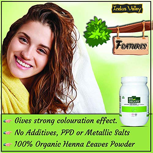 Indus Valley's Bio-Organic Henna Leaf Powder is 100% pure and organic. It doesn't contain any harmful chemicals or preservatives. It is made using the leaves of the Rajasthani Henna (Lawsoniainermis) plant. Henna leaves are shade dried and then grounded into a triple-sifted microfine powder which doesn't form lumps even after prolonged packaging. This superfine powder is very easy to use and non-messy. Henna Powder also helps in making hair healthy and strong. It is also effective in nourishing the scalp conditioning rough & dry hair and enhancing hair texture. This henna powder can be mixed with other natural hair dyes such as organic Indigo Chamomile or Manjishtha Root powder for achieving bright and exciting hair colors. Henna leaf powder leaves hair excitingly nourished ensuring grey coverage naturally. This is considered the safest way to color hair as henna is completely free from allergens and side effects. Being natural henna suits all skin & hair types.It's certified Ecocert USDA Organic Halal and alsodermatologist recommend it to lactating or pregnant mothers.