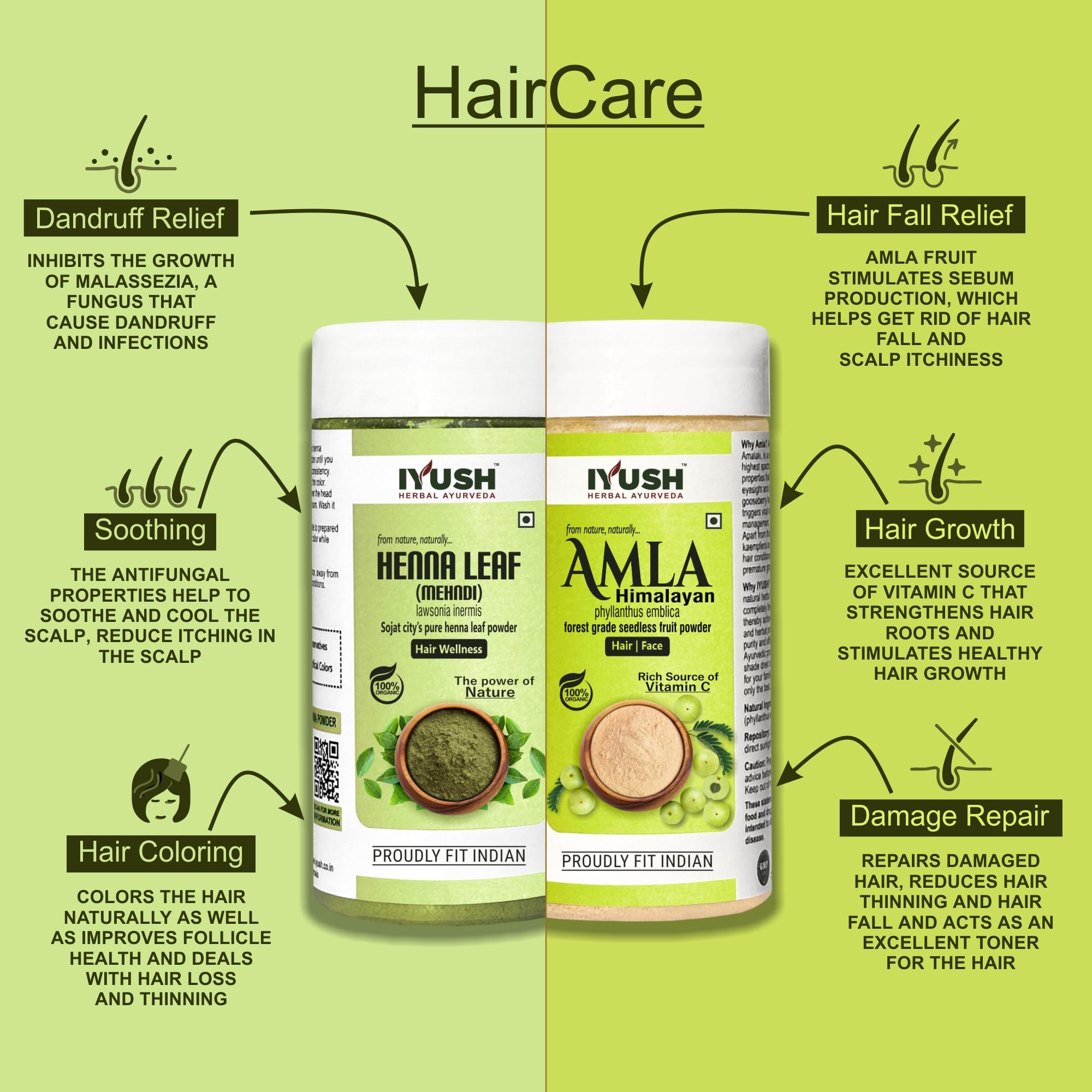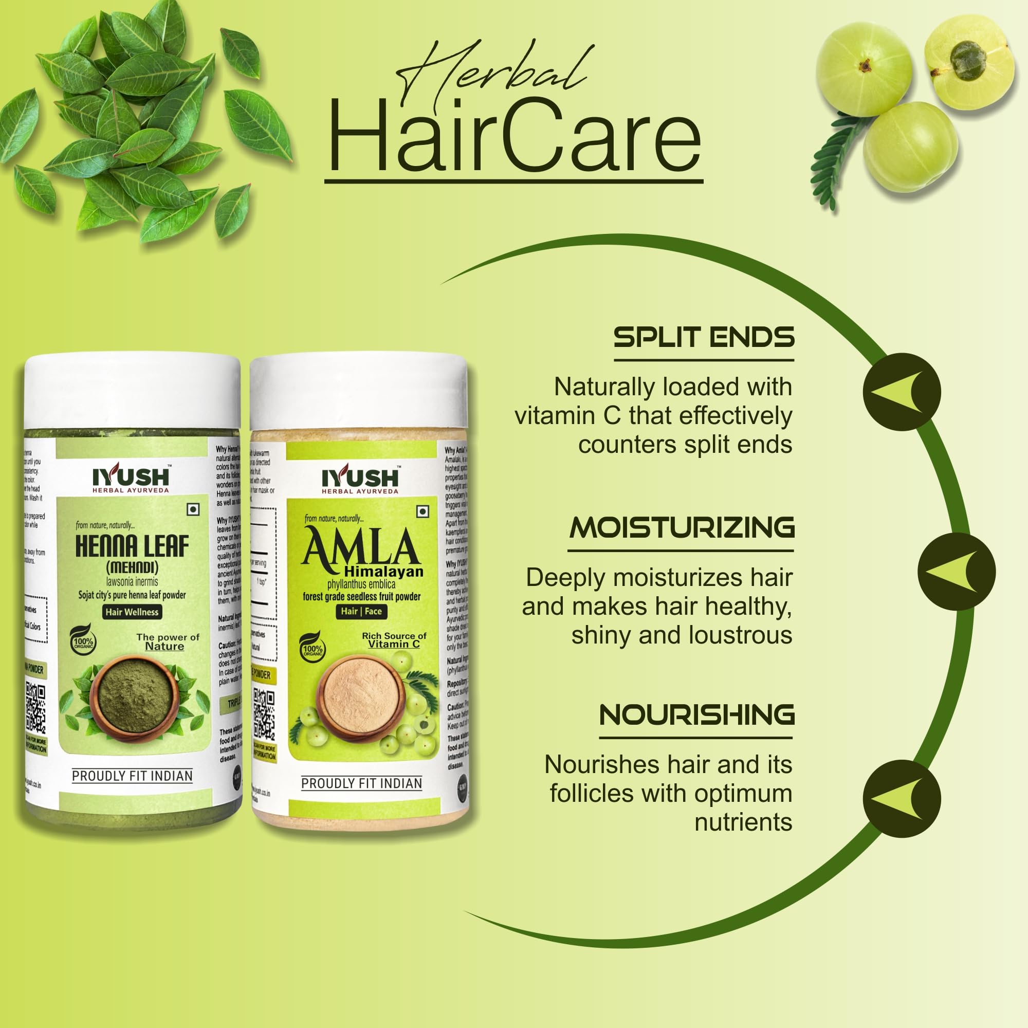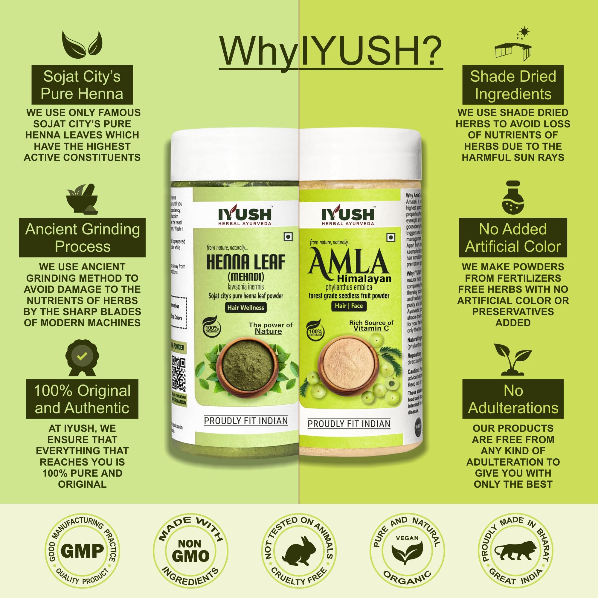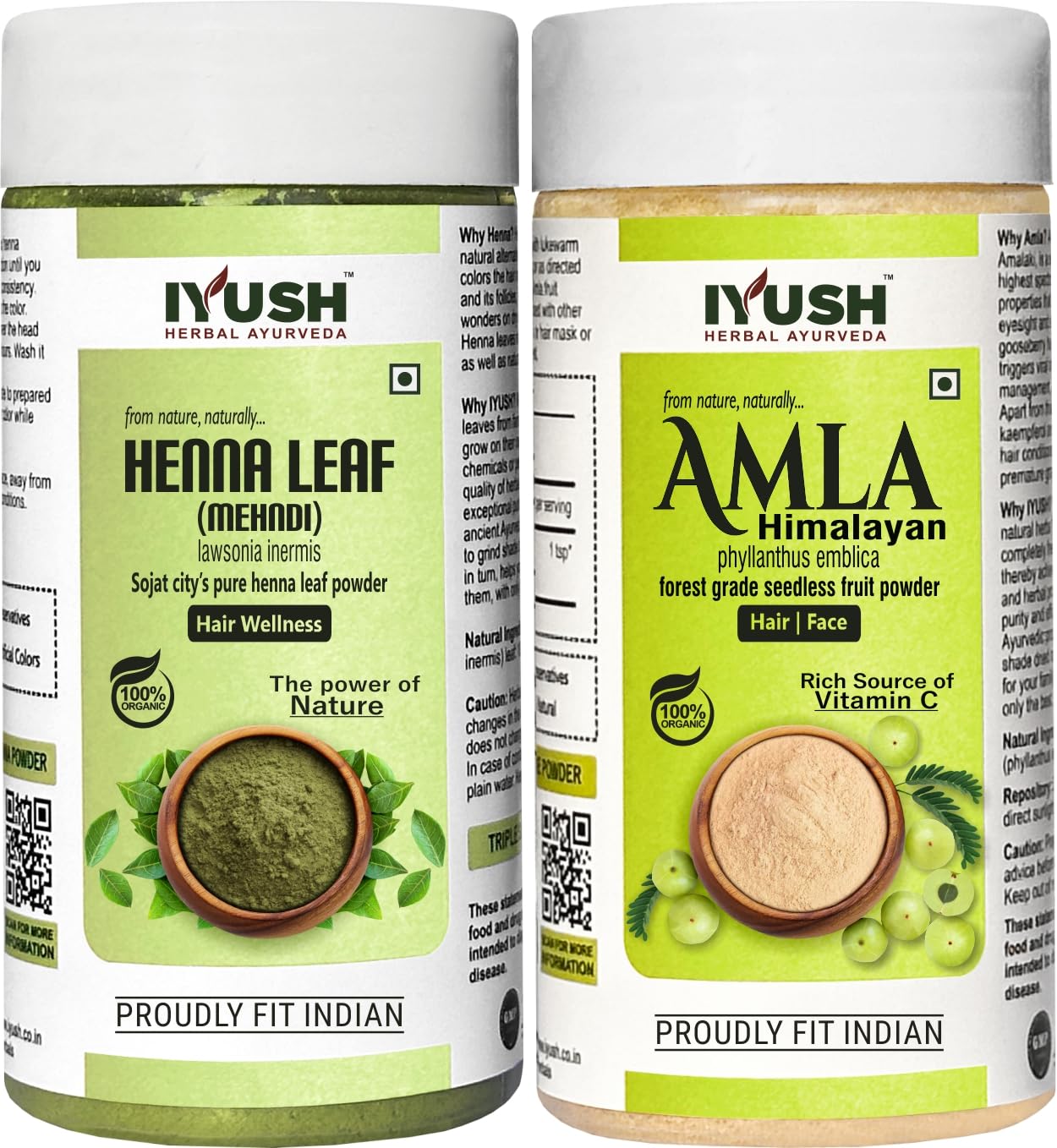 IYUSH Herbal Ayurveda Amla Powder and Henna Powder for Hair Colour 200gm | Natural Hair Colour without Chemical | Herbal Hair Colour | Hair Volume Powder | Hair Powder | Hair Pack | 100gm each