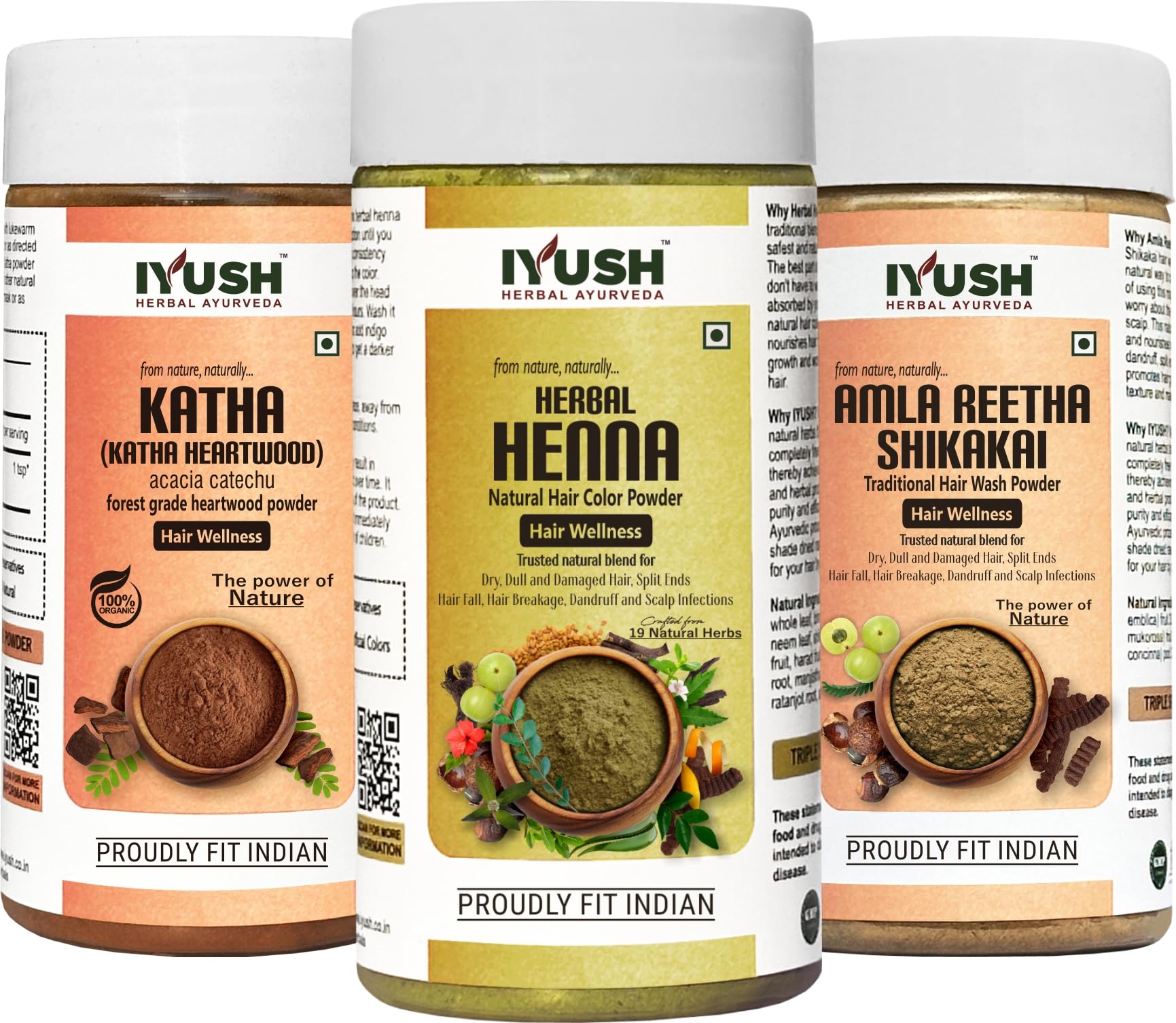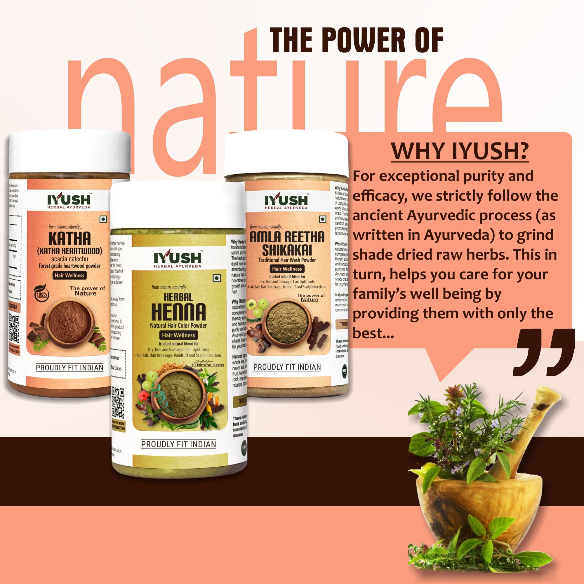 IYUSH Herbal Ayurveda Amla Shikakai Reetha Powder for Hair with Katha Powder and Herbal Henna Powder for Hair Colour 300gm | Herbal Hair Wash Powder | Hair Volume Powder | Hair Powder | 100gm each