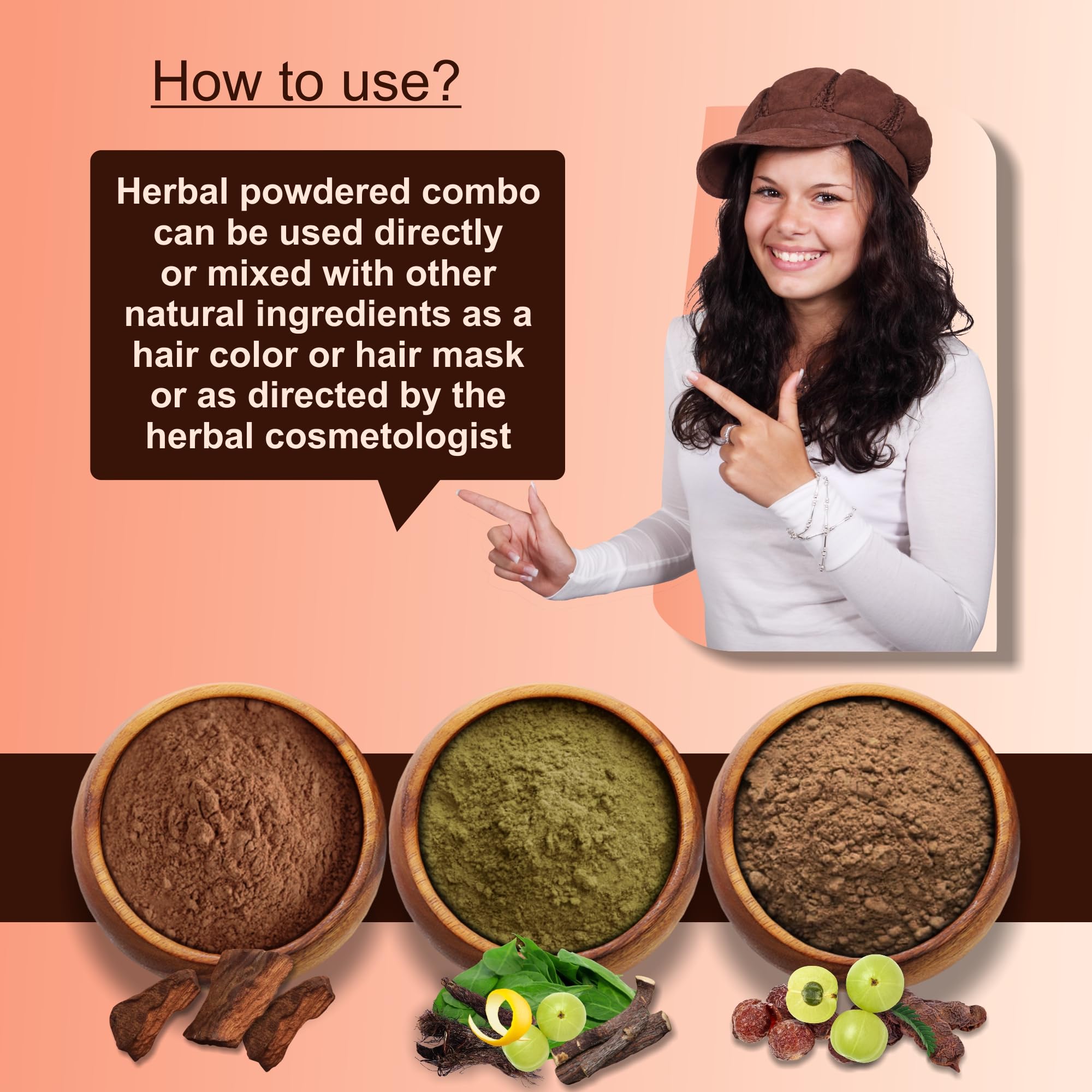 The Combo of Herbal powders is a combination of natural herbs that have been used since ages for a variety of hair care regimens. It is an organic natural combo made from shade-dried wild forest grade herbs that contain the highest active nutrients grown naturally without any harmful chemicals or pesticides or fertilizers.