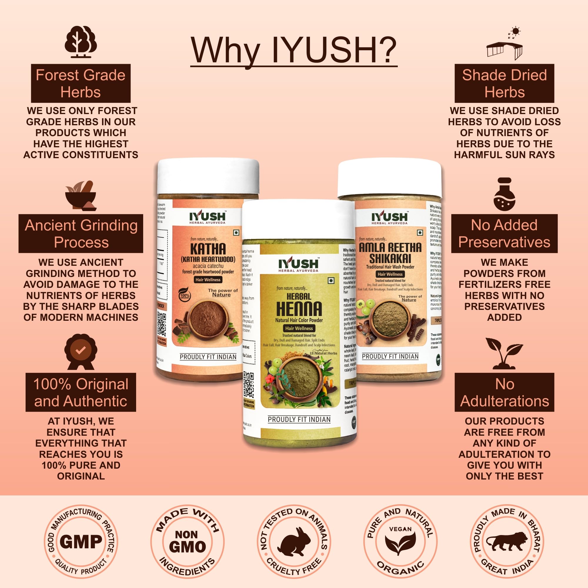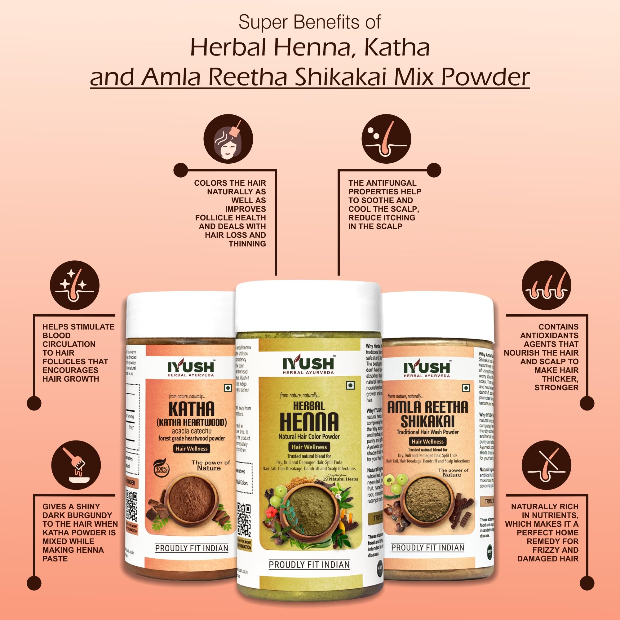 IYUSH Herbal Ayurveda Amla Shikakai Reetha Powder for Hair with Katha Powder and Herbal Henna Powder for Hair Colour 750gm | Herbal Hair Wash Powder | Hair Volume Powder | Hair Powder | 250gm each