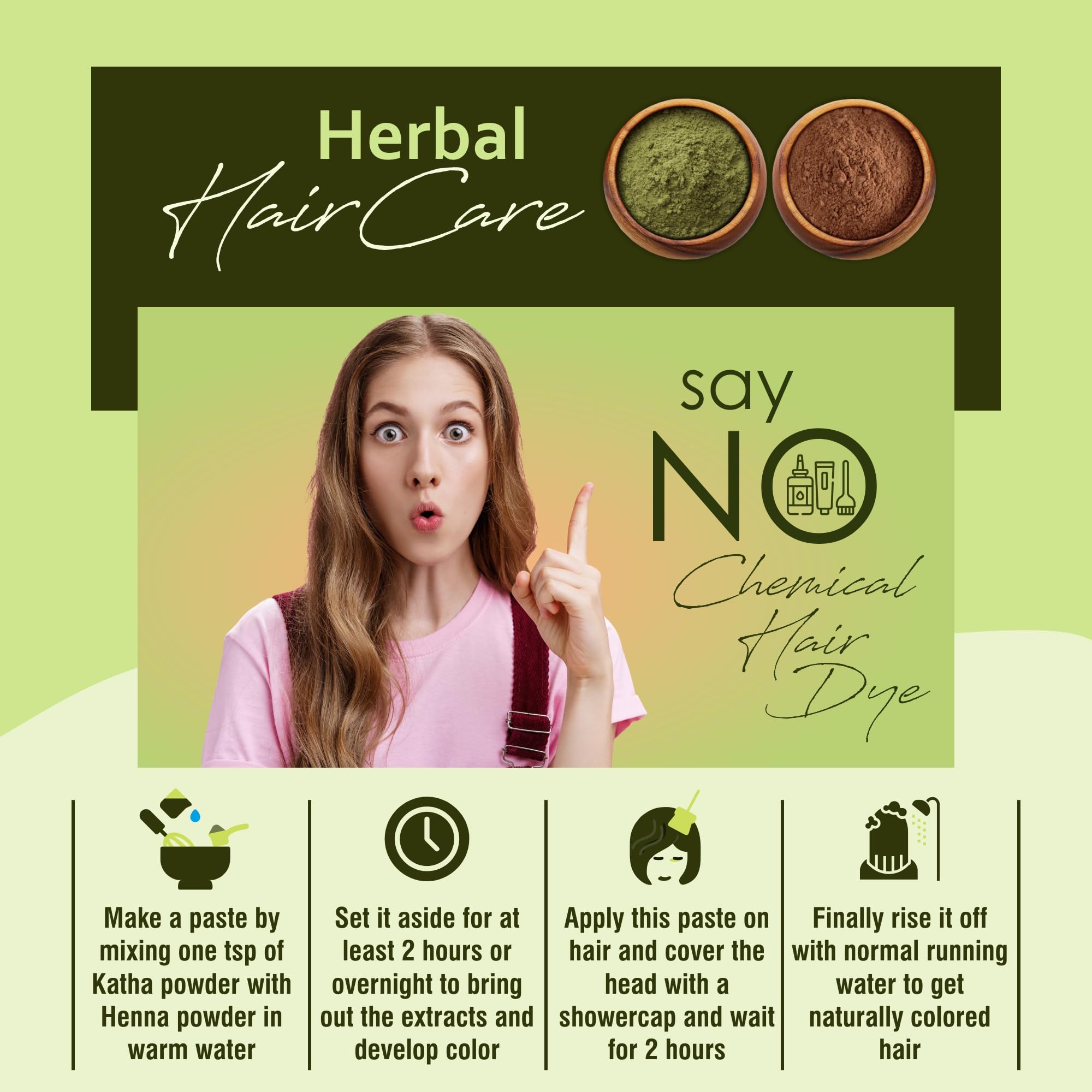 • Katha Powder and Henna Powder for Hair Colour : Henna powder is a popular and natural alternative to chemical-based hair dyes as it naturally dyes the hair to give it a dark color and when Katha powder is mixed with henna powder it gives a darker color to
