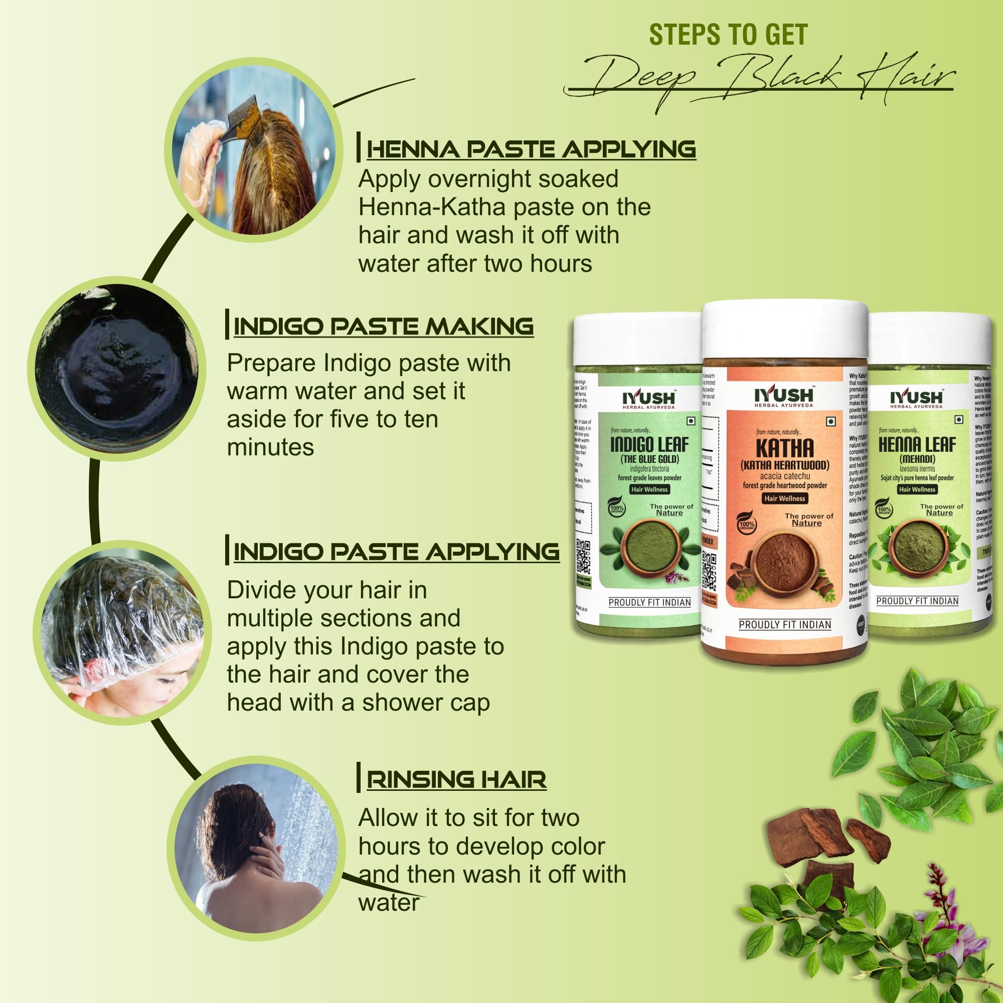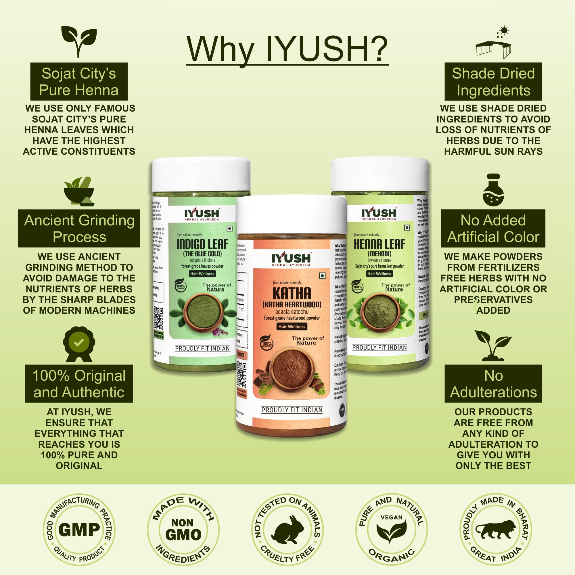 IYUSH Herbal Ayurveda Indigo Powder with Katha Powder for Hair and Henna Powder for Hair Colour 750gm | Natural Hair Colour | Hair Mask for Dry and Frizzy Hair | Hair Volume Powder |250G each