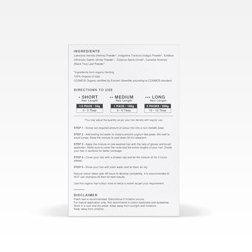This organic hair color blends Henna and natural plant powders such as Amla Indigo and Black Tea. It helps cover grey hair and gives your strands a uniform soft black color. Henna also deep conditions the strands and promotes overall scalp health. Natural leaf powders help prevent premature greying hair fall and hair thinning.
