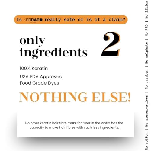 • 100% KERATIN. Kerrato hair fibres are made using 100% keratin and are suitable for people with thinning hair alopecia male pattern baldness female pattern baldness hair .