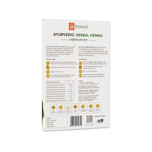 Krishna's herbal henna is a natural conditioner that renders burgundy color to greying hair and makes the hair soft and supple. All our products are made from quality items. We recommend that you read labels warnings and directions of all products before use and not rely solely on the information. Care instruction keep away from the items or products which may cause damage to this product.