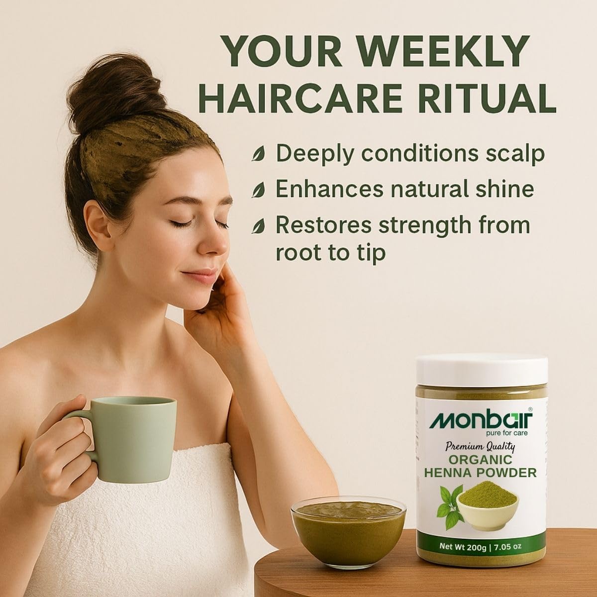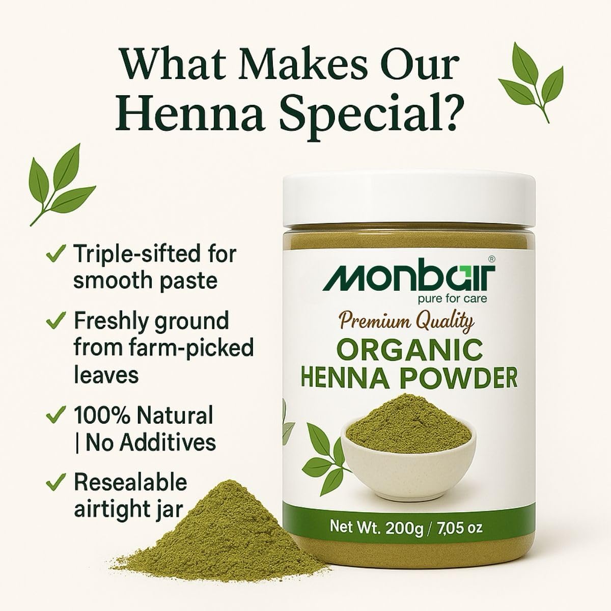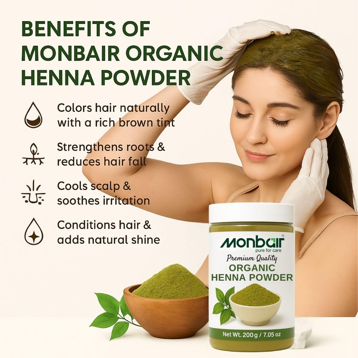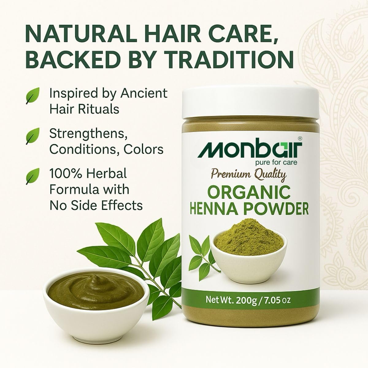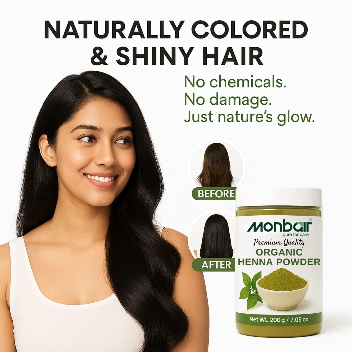 Monbair Henna Powder 100% Natural Hair Coloring & Conditioning Solution Elevate your hair care routine with Monbair Henna Powder crafted from premium naturally-sourced henna leaves. This chemical-free henna is your go-to solution for achieving rich vibrant color while deeply nourishing your hair. Embrace the power of Ayurveda with every application. Key Benefits: Natural Hair Coloring: Provides a rich reddish-brown hue to your hair without harmful chemicals or ammonia. Deep Conditioning: Strengthens hair from the roots leaving it soft shiny and silky smooth. Scalp Health: Helps reduce dandruff itching and other scalp issues with its natural cooling properties. Hair Growth: Promotes stronger thicker hair growth by improving scalp circulation. Why Choose Monbair Henna Powder? 100% Pure & Organic: Free from synthetic additives preservatives and artificial colors. Triple-Sifted Fine Powder: Easy to mix and apply ensuring a smooth lump-free paste. Versatile Use: Can be used for hair coloring conditioning or as a base for creating customized henna blends. Suitable for All Hair Types: Gentle yet effective for normal dry and oily hair. How to Use: For Hair Coloring: Mix Monbair Henna Powder with water or tea decoction to form a paste. Let it rest for 4-6 hours then apply evenly on hair. Leave for 2-3 hours and rinse with water. For Hair Conditioning: Combine with curd egg or aloe vera for an all-natural hair mask. Let Monbair Henna Powder be your natural alternative to chemical hair dyes delivering vibrant color and unparalleled nourishment. Ideal for anyone seeking a healthy chemical-free approach to hair care.