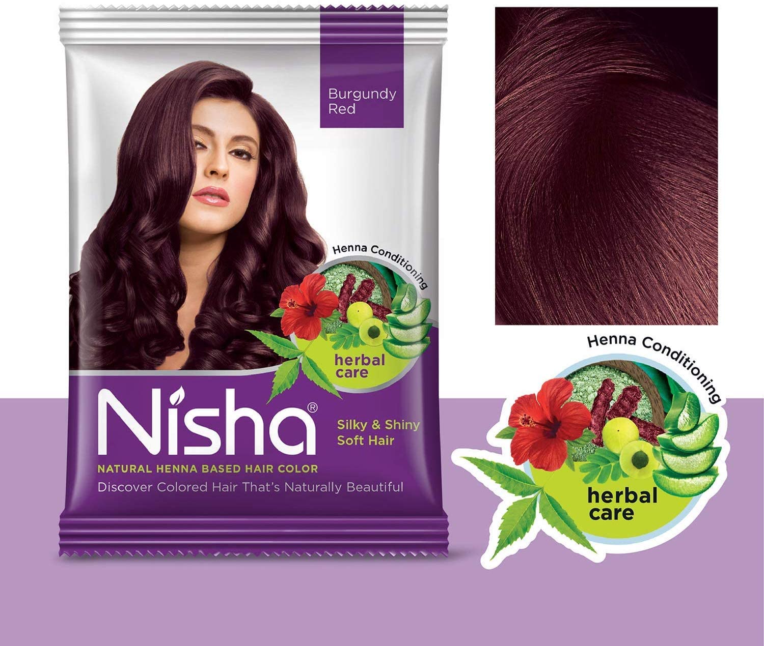 NATURAL HENNA HAIR COLOR Achieve a rich burgundy red shade with Nisha's Henna Hair Color designed to add depth and shine to your hair.