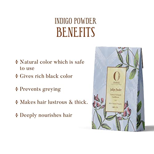 Organically farm-grown indigo leaves powder for soft shiny & deeply conditioned hair. Intensifies the henna coloured hair to a rich black hue. 1. Natural vegan hair colourant derived from plant Indigo Tinctoria. 2. It imparts a dark hue to henna coloured hair. 3. Nourishes hair stimulating new growth reduces dandruff & maintains a healthy scalp. 4. Strengthens the roots & strands.