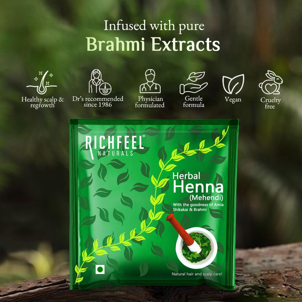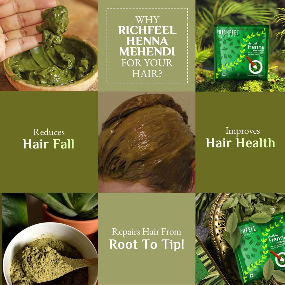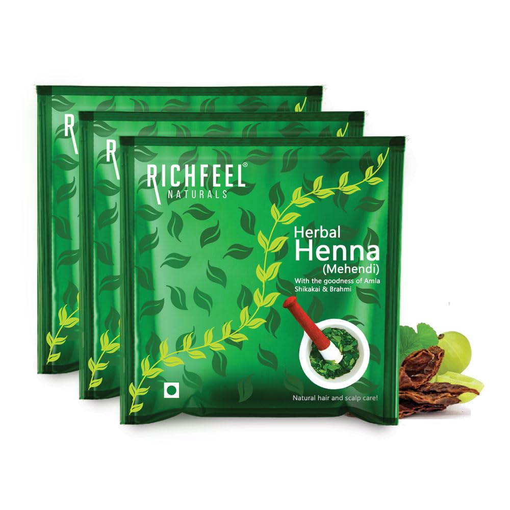 Henna is a trusted natural and effective way to cover your grey hair. Not only that but Henna also makes your hair strong voluminous and shiny. Richfeel Henna mehendi for hair has been prepared from pure Henna leaves with the highly efficacious combination of Arnica Amla Reetha & Shikakai. Arnica is a perennial herb belonging to the sunflower (Asteraceae) family. It is very effective for the treatment of split ends Amla or the Indian gooseberry is a wonderful beauty ingredient especially for your hair. This mehendi for hair prevents dandruff gives your hair a natural shine while nourishing hair from root to tip. It also helps reduce hair fall Reetha or soapnut is excellent at conditioning and rejuvenating the hair Shikakai is a wonderful herb that has been used for years for hair care. This mehendi powder helps promote hair growth and reduces hair fall. Just add the mix in water apply it on your hair for one hour & then wash it off. It not only gives your hair a natural color but also nourishes it. With Richfeel Heena mehendi for hair grey hair can be covered naturally!