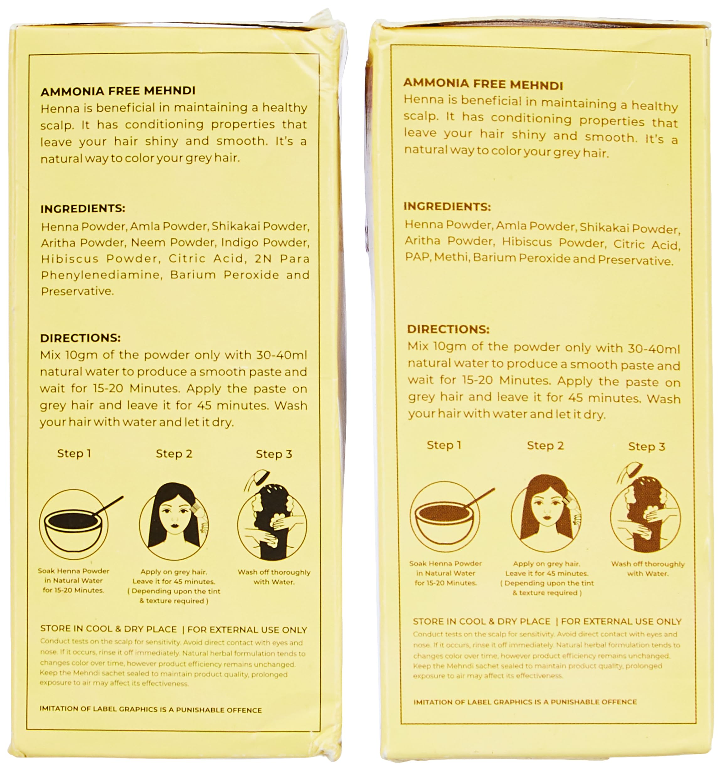 Package Content 1 Black Mehndi Ammonia Free Henna 1 Brown Mehndi Ammonia Free Heena. Quantity 200 Gm (Each 100 Gm)