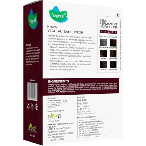 • Ayush certified - contains no harmful synthetic chemicals: no ppd no ammonia no parabens no peroxide