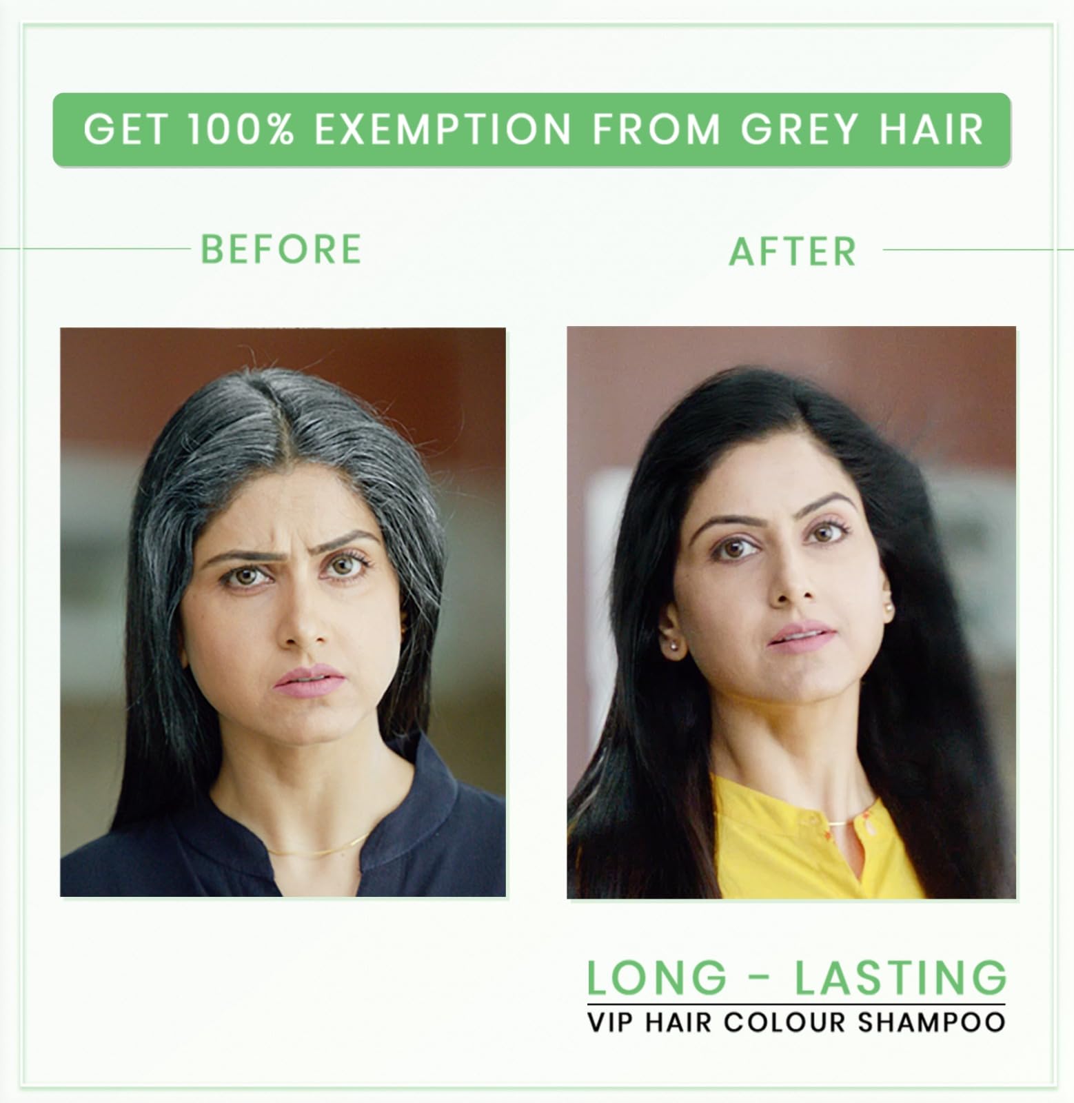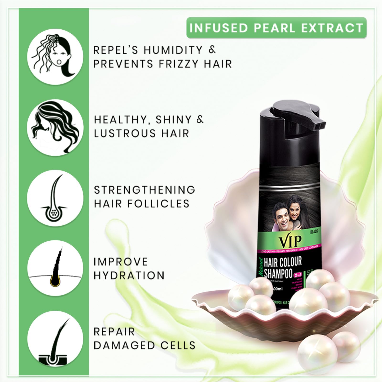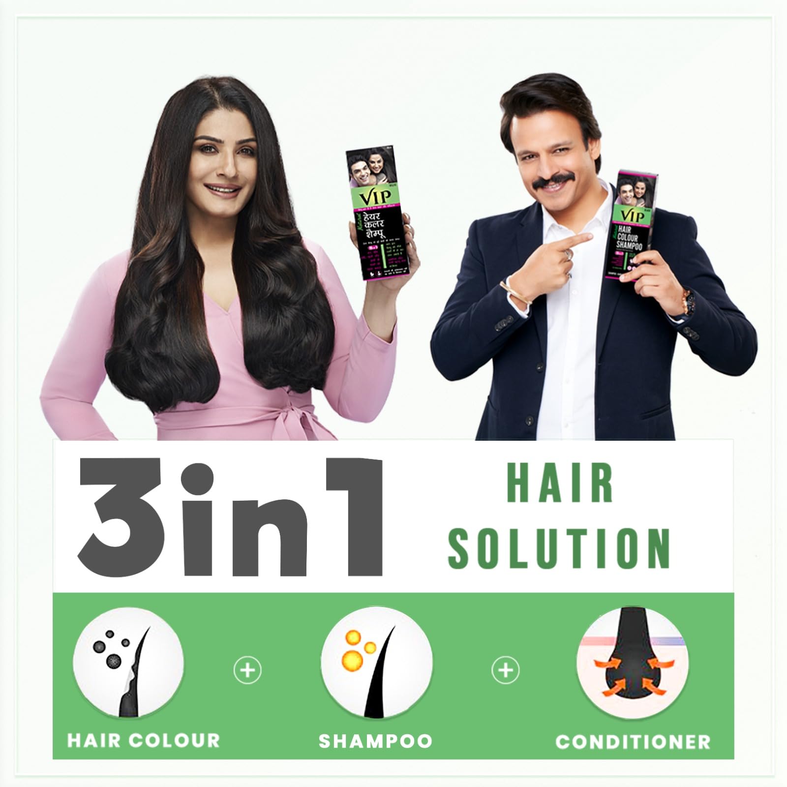 VIP Hair Colour Shampoo can be applied with bare wet hands. It is a combination of Shampoo Hair Color & Conditioner and is purely natural & enhanced with pearl extract. One time application gives amazing results in just 15 minutes. It does not require the use of gloves. VIP Hair Colour Shampoo is one of the bestselling hair colour shampoos and has been recognized by the industry for its pleasant fragrance and ease of use. Each application lasts for 3-4 weeks (based on number of washes). However a re-touch is recommended every 2-3 weeks to keep your looks Young & Trendy. Key Features Easy application for Hair Beard Chest & Moustache No need to use Gloves no staining on Skin or Hands No ammonia Natural ingredients Natural colour in just 3-minutes Get DONE in 15 minutes for any length hair Directions for Use Ensure your hair is completely dry without oil & dust. Wet your hands thoroughly. Take generous amount of shampoo on your wet hands and mix it well. Let it lather. Apply the lather on your hair uniformly and massage the head thoroughly. Wash your hands within 3 minutes from the time of contact using soap or hand wash. Wait for 15 minutes. Then rinse your hair with adequate water. Preliminary test should be done to identify whether your skin is prone to any sensitivity.