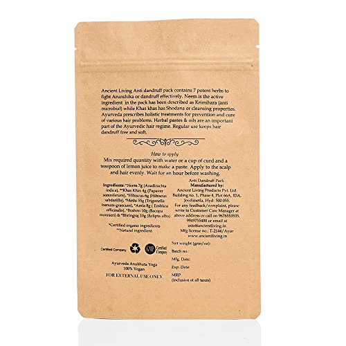 Ancient Living Anti Dandruff Pack contains a blend of seven potent ayurvedic herbs such as Neem Khas Khas Hibiscus Methi Amla Brahmi & Bhringraj .