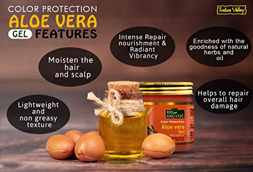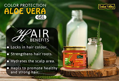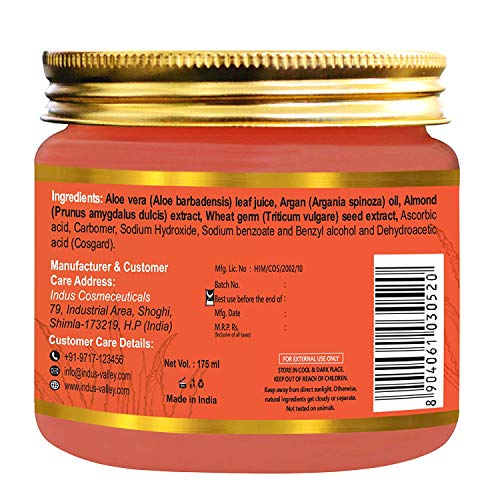 Indus Valley Bio-Organic Aloe Vera Gel is a 100% pure and natural gel that is extracted from the fresh leaves of organically grown aloe vera plants in the lower foothills of the Himalayas. Packed with the perfect balance of certified organic herbs and extracts like rose wheat germ green tea honey and lemon peel it makes for an ideal choice for both skincare and hair care. Its ultra-hydrating calming and soothing properties penetrate deep into the skin reducing dryness and maintaining skin elasticity and firmness. Aloe vera gel for acne comes loaded with antioxidants and antibacterial properties that help to unclog pores combat acne and make your skin look younger and rejuvenated. Rich in vitamins E and C it helps to stimulate hair follicles reduces dandruff and hair loss and promotes a healthy scalp. Regular application of this 100% pure aloe vera gel for skin and hair during both summers and winters can rejuvenate and revive the overall health of your hair and skin.