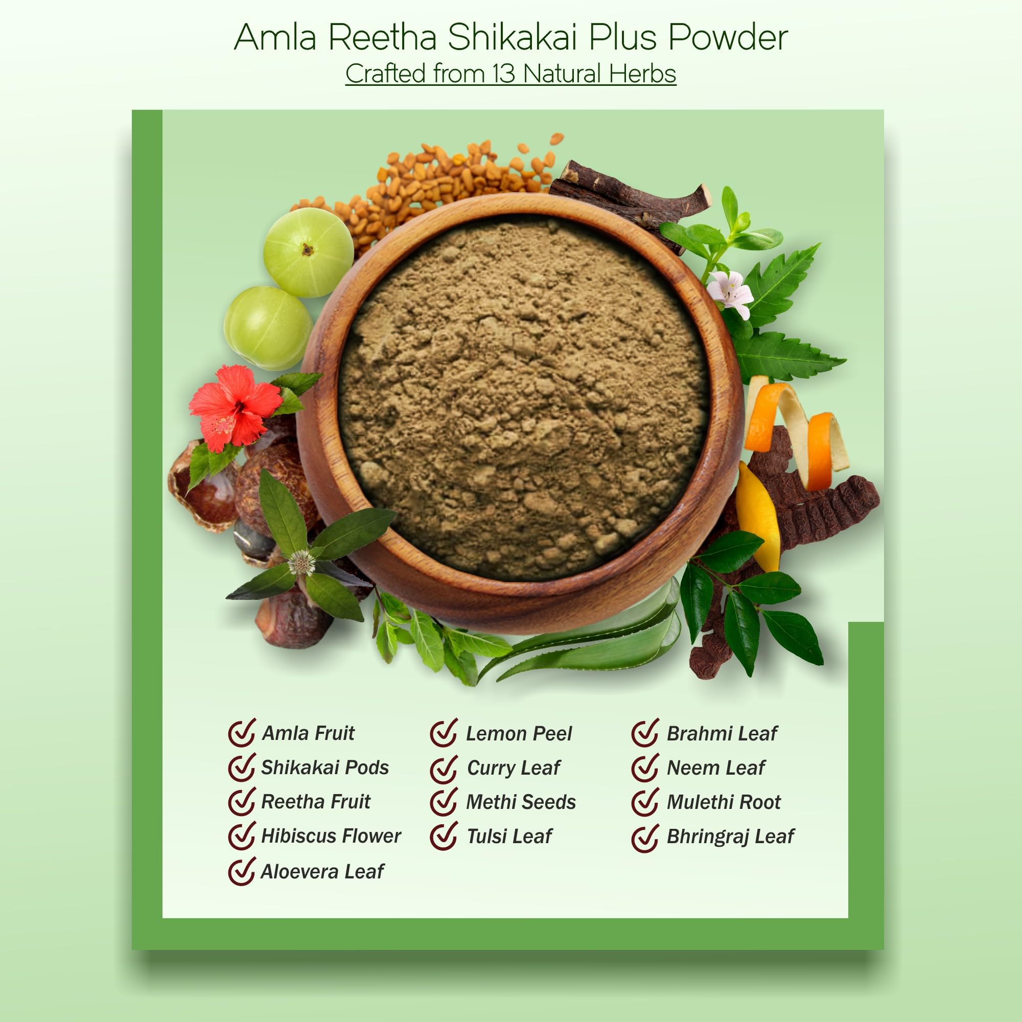 • Amla Shikakai Reetha Powder for Hair Nourishment: It is an ancient and traditional blend of 13 potent natural herbs like Amla Reetha Shikakai Bhringraj Hibiscus Brahmi Methi Tulsi Neem Aloevera etc. mixed in unique proportions. It can be used as natural h
