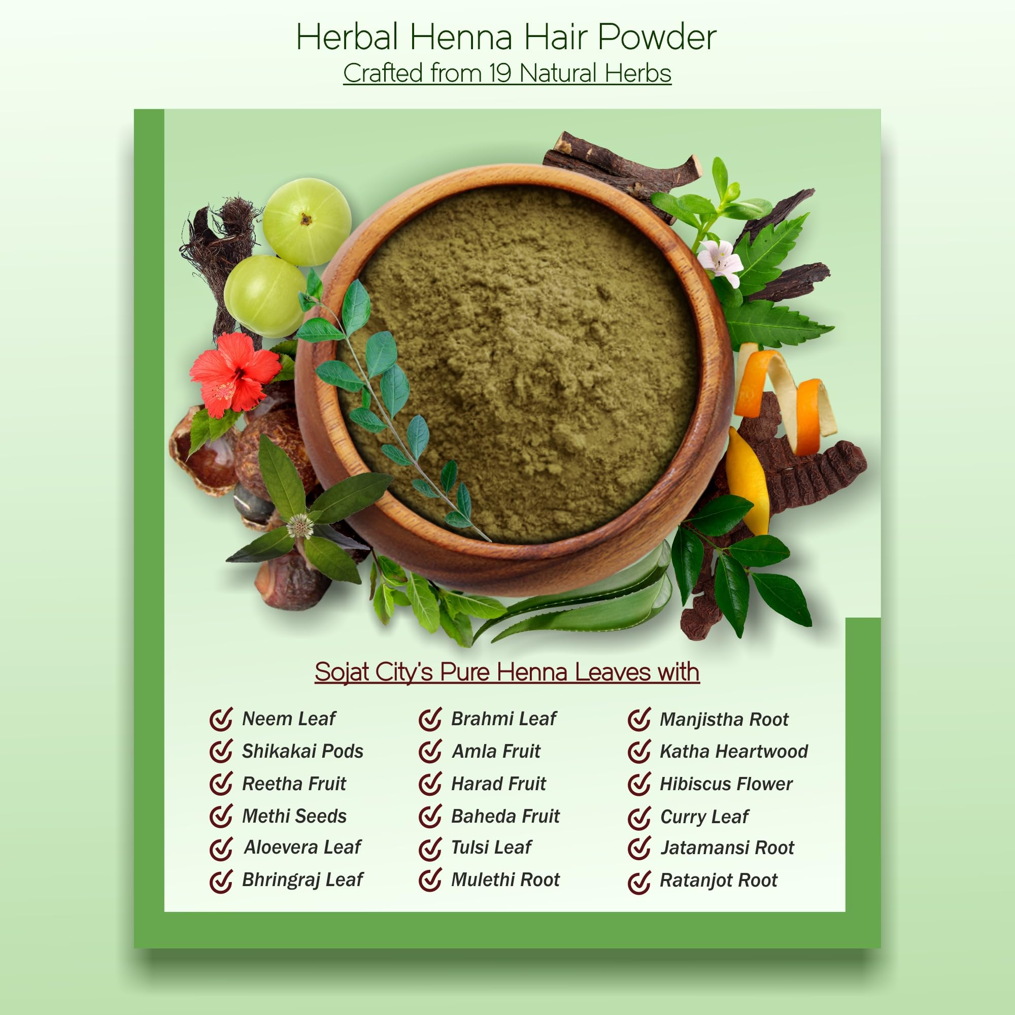 • Herbal Mehndi for Hair Nourishment: It is an ancient and traditional blend of 19 potent natural herbs like Amla Reetha Shikakai Bhringraj Hibiscus Brahmi Methi Tulsi Neem Aloevera Mulethi Triphala Manjistha Jatamansi Katha etc. mixed in unique proportions