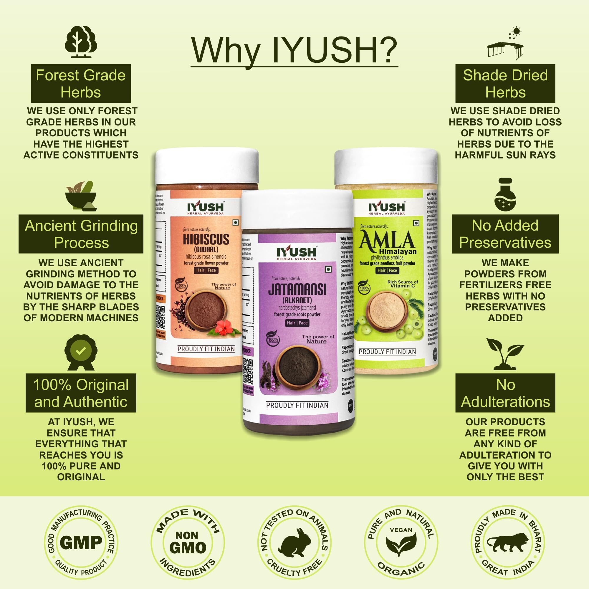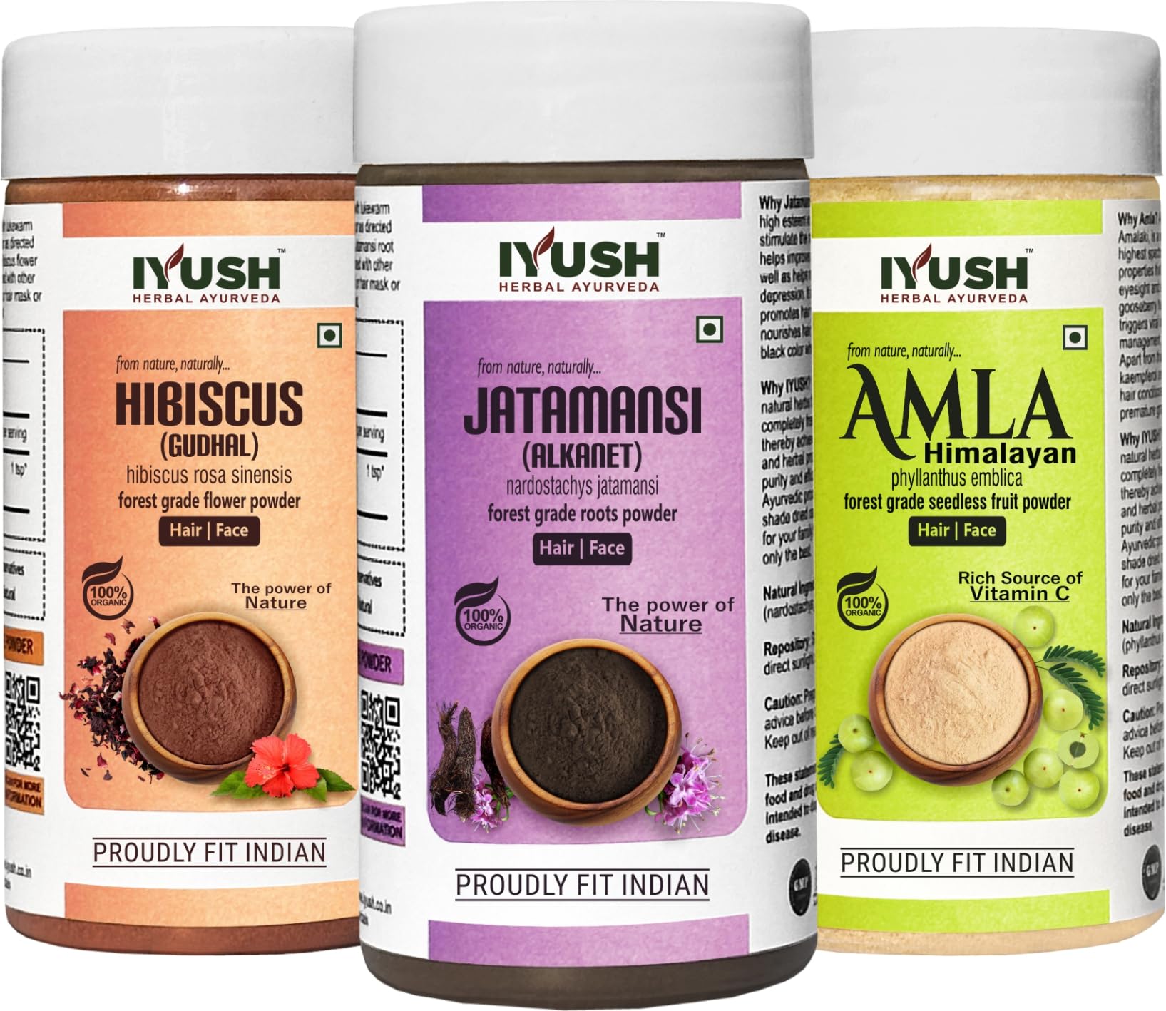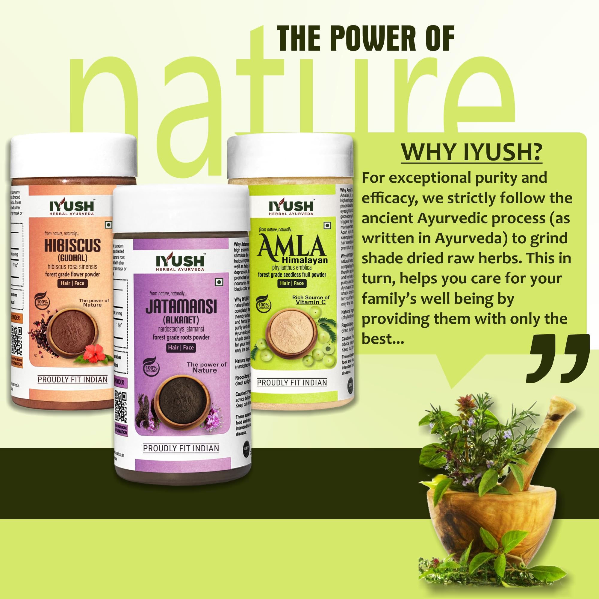 IYUSH Herbal Ayurveda Jatamansi Amla Hibiscus Powder for Hair Growth 750gm | Amla Powder Hibiscus Powder and Jatamansi Powder | Hair Volume Powder | Skin Care & Hair Care | (250gm each)