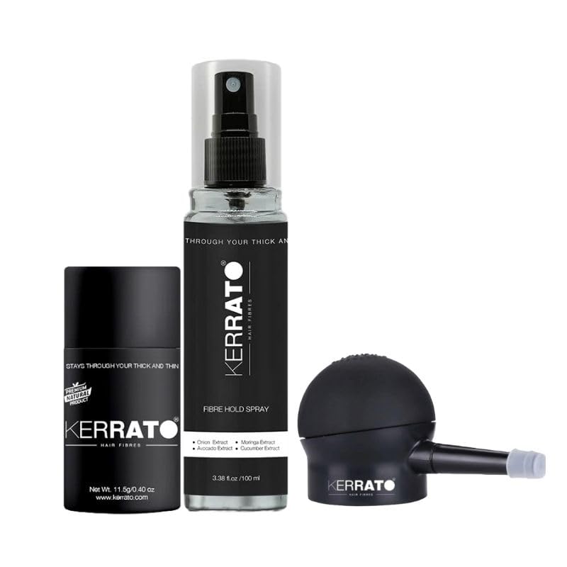 KERRATO HAIR FIBRES 11.5G (Jet Black) With Fibrehold Spray (100ML) And Pump |Conceals Hair Loss Instantly - Natural Hair Thickener & Fibers For Thin Hair