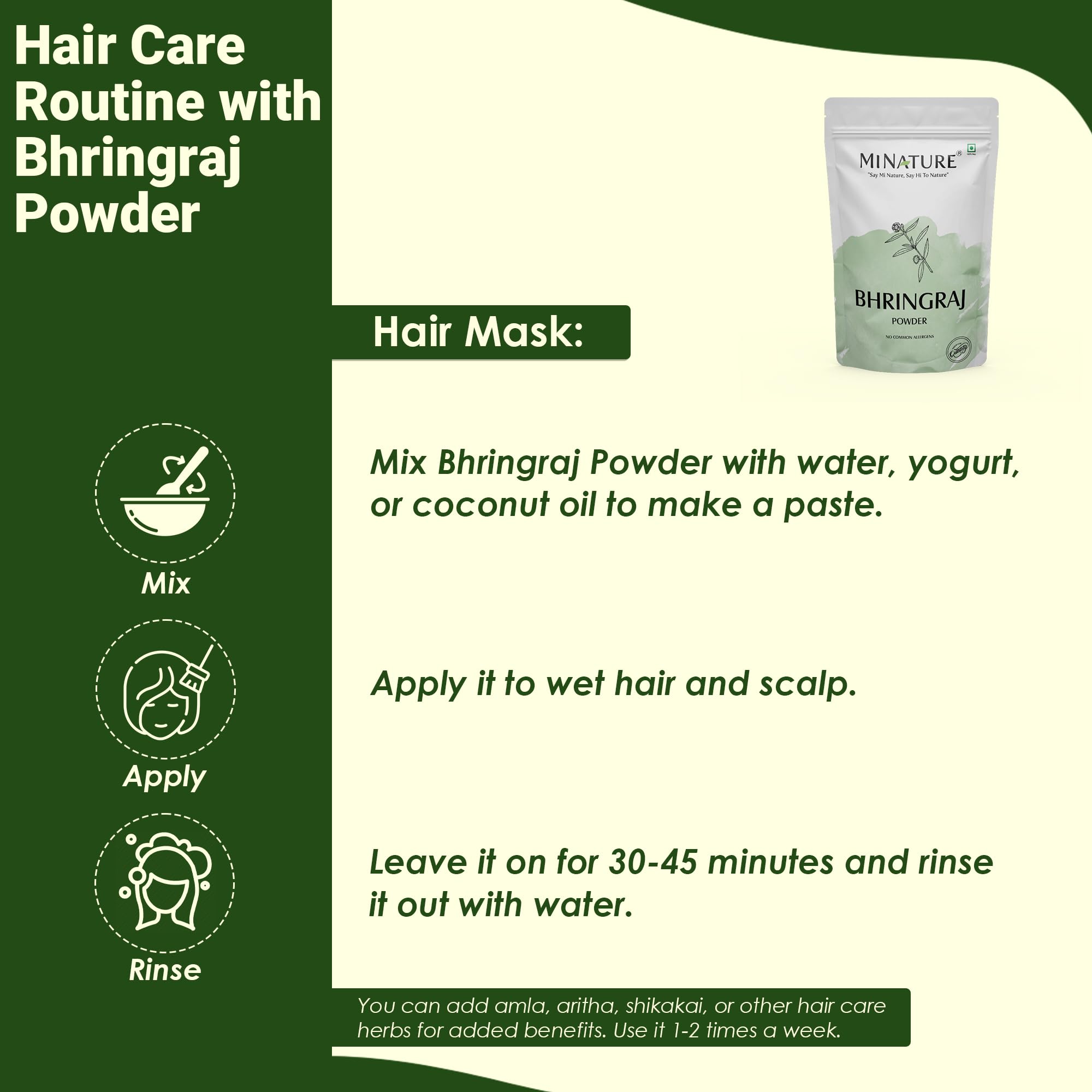 Mi Nature Bhringraj Powder - 100g (3.5 Oz)Discover the Mi Nature DifferenceAt Mi Nature we believe in the power of traditional herbs provided as nature intended. Our Bhringraj powder stands apart from others in the market through our meticulous attention to quality and purity. Unlike mass-produced alternatives Mi Nature Bhringraj is:â Harvested at peak potency to preserve natural compoundsâ Shade-dried to maintain its beneficial propertiesâ Stone-ground using traditional methods for optimal textureâ Processed in small batches to ensure quality controlâ Triple-sifted for consistent fine powder textureâ Lab-tested to verify purity and absence of contaminantsThe Traditional "King of Herbs" for Hair CareBhringraj (Eclipta Alba) holds a special place in Ayurvedic traditions where it earned the title "King of Herbs" for hair care. This remarkable herb has been used for centuries in traditional hair treatments throughout India and continues to be valued for its natural properties. Our Bhringraj powder brings this time-honored tradition to your modern self-care routine.100% Pure & Natural QualityWhen you choose Mi Nature Bhringraj powder you're getting an herb that is:â 100% pure Eclipta Alba with no fillers or additivesâ Free from preservatives colors and fragrancesâ Unbleached and unprocessed to maintain natural propertiesâ Non-GMO and sustainably sourcedâ Packaged in a resealable pouch to maintain freshnessâ Rich in natural color and characteristic aromaComprehensive Guide to Using Bhringraj PowderOur Bhringraj powder offers versatile applications for your hair care routine. Here are detailed instructions for the most popular methods:1. Traditional Hair Mask (Weekly Treatment) Mix 2-3 tablespoons of Bhringraj powder with warm water to form a smooth paste For added benefits replace water with yogurt aloe vera gel or coconut milk Apply thoroughly to clean damp hair from roots to ends Massage gently into scalp using circular motions for 2-3 minutes Cover with a shower cap to prevent drying out Leave for 30-45 minutes (do not allow to completely dry) Rinse thoroughly with lukewarm water until water runs clear Follow with a mild shampoo if needed2. Herbal Oil Infusion (Deep Conditioning) Combine 3 tablespoons of Bhringraj powder with 1 cup of coconut sesame or olive oil Heat the mixture on low flame for 10-15 minutes stirring occasionally (do not boil) Remove from heat once the oil takes on a greenish tint Allow to cool completely then strain through a fine cloth Store in a clean dark glass bottle Apply as a pre-wash treatment leaving on for 1-2 hours before shampooing Can also be used as a daily scalp massage oil (use 1-2 teaspoons)3. Herbal Hair Rinse (After Shampooing) Steep 2 tablespoons of Bhringraj powder in 2 cups of hot water for 15-20 minutes Strain the liquid and allow to cool to room temperature After shampooing pour the rinse over your hair as a final step Do not rinse out - allow hair to dry naturally This helps balance scalp pH and adds a natural shine4. Combined Herbal Treatment (Enhanced Benefits) Create customized blends by combining equal parts of Bhringraj with complementary herbs: Amla: For extra conditioning and shine Brahmi: For scalp health support Shikakai: For natural cleansing properties Fenugreek: For additional moisture Follow application methods for masks or rinses as described aboveFor Optimal Results: Use consistently as part of your regular hair care routine Apply treatments 1-2 times per week initially Adjust frequency based on your hair's response Store unused powder in a cool dry place away from direct sunlight Keep container tightly sealed between usesTraditional Benefits of BhringrajIn Ayurvedic tradition Bhringraj is valued for numerous hair care benefits: Traditionally used to support a healthy scalp environment May help maintain natural hair color when used regularly Can improve the appearance and texture of hair over time Helps nourish hair from root to tip Provides a natural alternative to commercial hair products Supports traditional hair care practices focused on scalp healthSuitable for All Hair TypesMi Nature Bhringraj powder works wonderfully for diverse hair needs: Dry Hair: Adds natural conditioning elements Oily Hair: Helps balance scalp conditions Dull Hair: May enhance natural shine and luster All Hair Textures: Works with straight wavy curly or coily hair Unisex Formula: Equally effective for men and womenProper Storage and CareTo maintain the quality and effectiveness of your Bhringraj powder: Store in a cool dry place away from direct sunlight Keep container tightly sealed after each use Use a dry spoon to remove powder from container Avoid introducing moisture into the container Best used within 18 months of opening Check for fresh aroma and color before each useExperience the TraditionBy incorporating Mi Nature Bhringraj powder into your hair care routine you're connecting with an Ayurvedic tradition that has valued this botanical ingredient for centuries. Experience the difference that pure herbal care can make for your hair appearance and texture.Our Bhringraj Powder provides a natural alternative to conventional hair products offering a path to beautiful-looking hair through the power of pure botanical ingredients.100g (3.5Oz) | 100% Natural | Free from Harsh Chemicals | Suitable for All Hair Types
