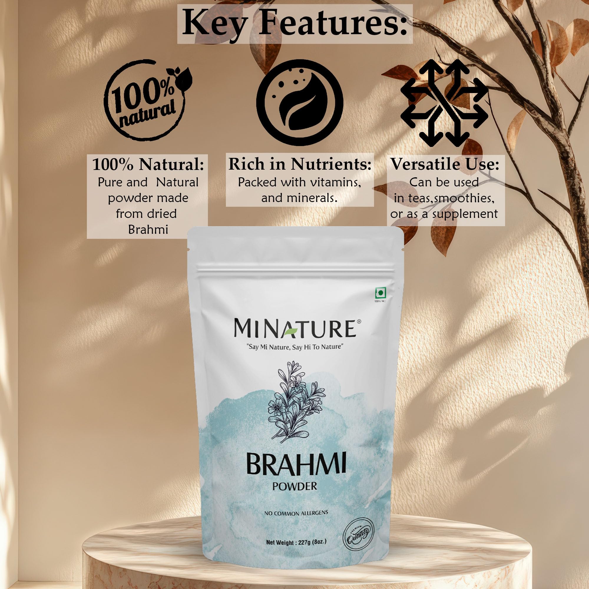 Mi Nature Brahmi Powder (Bacopa Monnieri) - 227 g / 8 OZ / 1/2 lbUnlock the secret to luscious locks with Mi Nature's Brahmi Powder! Hair Growth Booster: Packed with natural goodness this Brahmi powder promotes hair growth from root to tip. ð 100% Pure: Our Brahmi powder is pure and Natural ensuring you get the best for your hair. ð Natural Brilliance: Enhance the natural shine and brilliance of your hair with the power of Brahmi. ð«227g of Goodness: Generous 227g / 8 OZ / 1/2 lb pack to keep your hair care routine stocked and ready. Easy to Use: Mix into your favorite hair mask oil or DIY hair care recipe for a spa-like treatment at home. ð¡Radiate confidence with Mi Nature's Organic Brahmi Powder - your key to vibrant healthy hair!