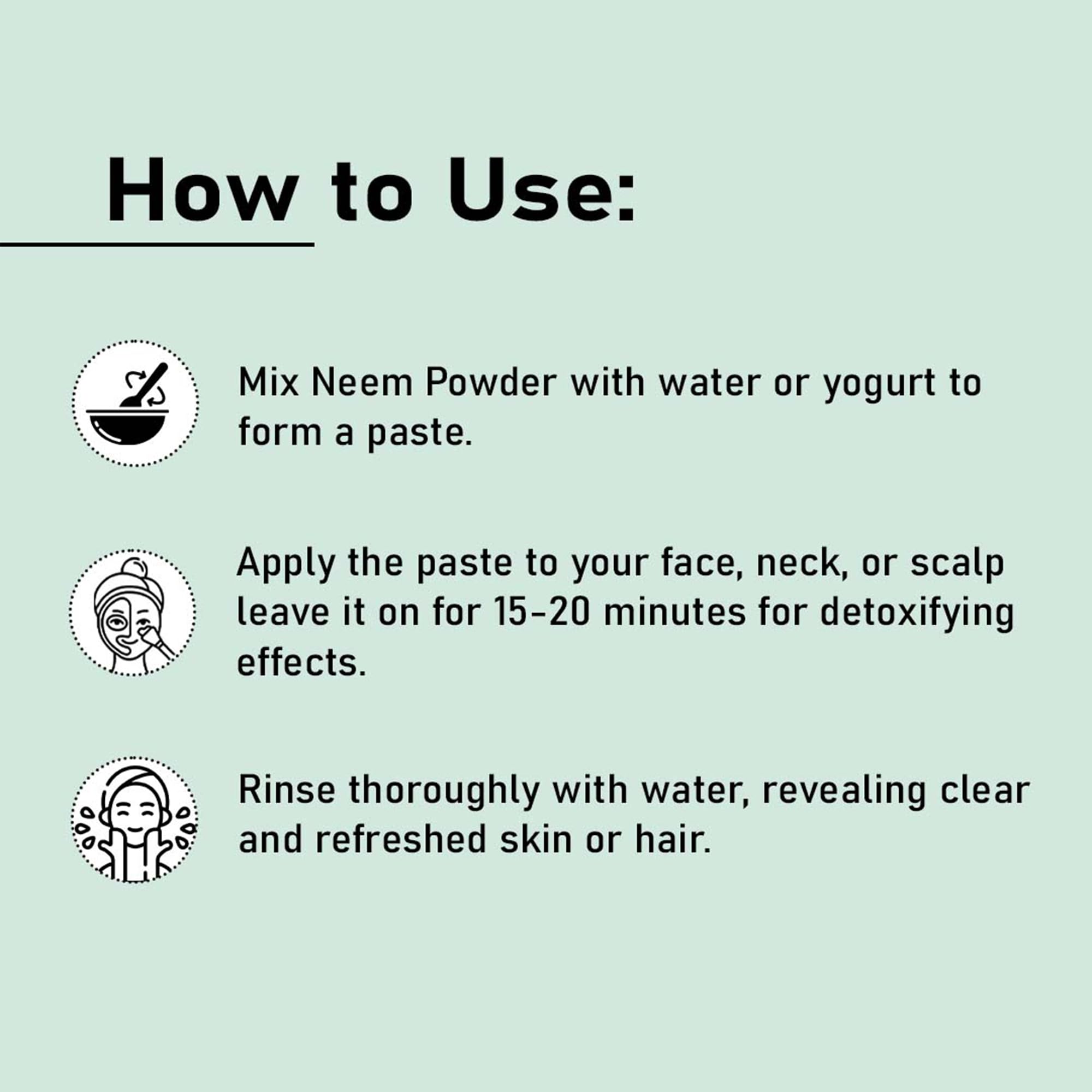 100% Pure Neem Leaf Powder: Mi Nature Neem Leaf Powder is made from 100% pure Azadirachta Indica (Neem) leaves. It is carefully processed to retain the full potency of the plant offering you all the natural benefits without any additives or preservatives.