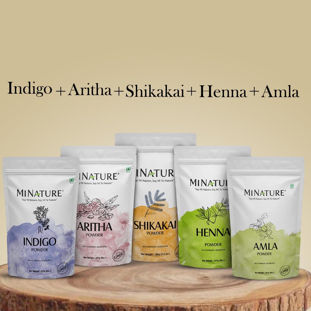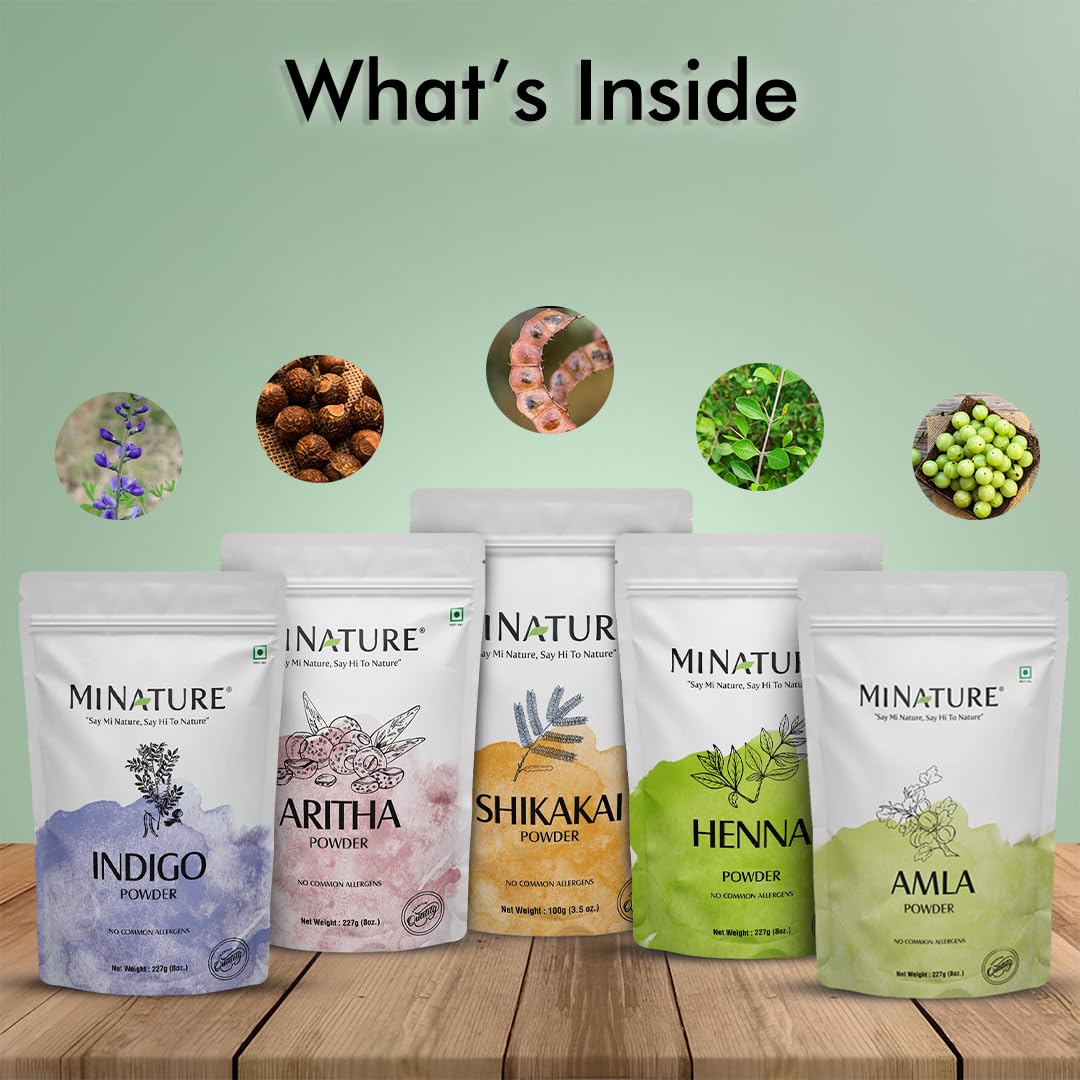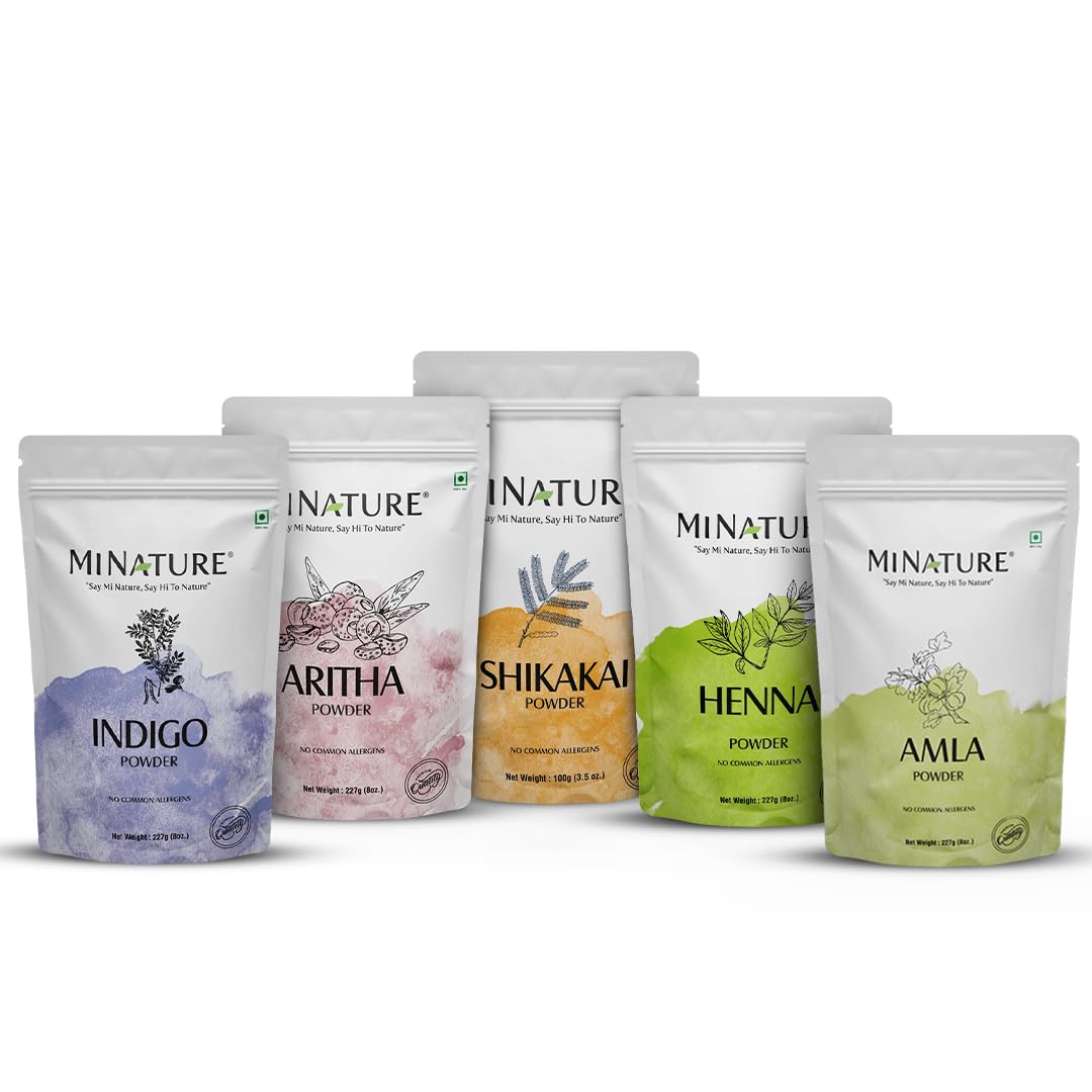 Introducing our Minature Pack of 5 a hair care revelation featuring Organic Henna Shikakai Amla Aritha and Indigo Powder. Unlock the secret to stunning Shine as regular use infuses your hair with a natural luster elevating its appearance to a radiant new levelWitness the magic of maintaining your hair's natural pH balance as these natural powders elevate your hair care routine with a nurturing and holistic approach. Embrace an environmentally thoughtfully crafted with pure natural and chemical-free ingredients caring for both your hair and the planet. Our Unisex pack caters effortlessly to both men and women designed to suit all hair types and preferences making it an inclusive and versatile hair care solution. Experience the ultimate hair care experience combining the finest Organic Henna Shikakai Amla Aritha and Indigo Powder for unparalleled hair perfection.