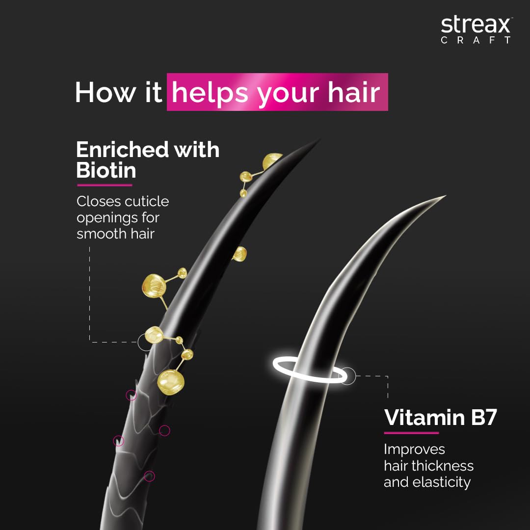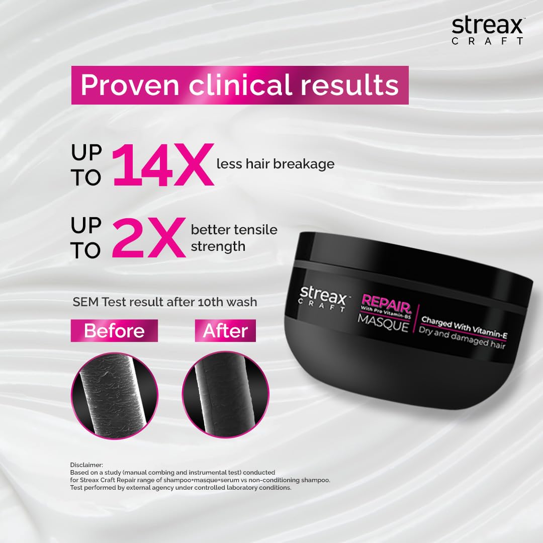 Streax CRAFT Repair Hair Masque is a powerful reconstructing hair mask treatment that delivers a potent blend of nourishing ingredients to dry damaged hair. The Biovit-A-OX complex a combination of Biotin antioxidant-rich Vitamin B5 and Vitamin E provides a surge of nourishment to repair and revitalize damaged hair. Additionally Hydrolyzed Flax Protein and Ceramide mimic molecules work together to strengthen and repair the hair's internal structure reducing damage by 14 times.