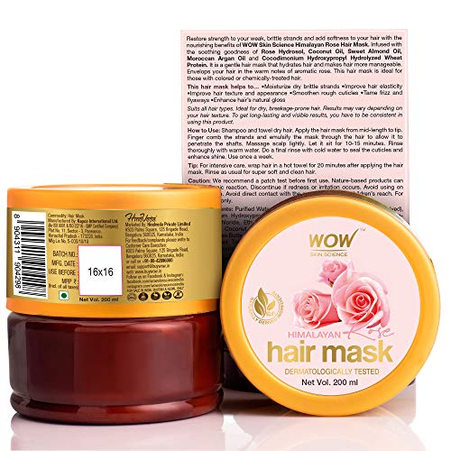 Help restore strength to your weak brittle strands and add softness to your hair with the nourishing benefits of WOW Skin Science Himalayan rose hair mask. It is a volumizing hair mask that helps to add lush movement to your weak dull lifeless hair. It also leaves your hair smelling fresh and fragrant. The hair mask is infused with the soothing and moisturizing goodness of rose hydrosol coconut oil sweet Almond oil argan oil and hydrolysed wheat protein. It is a gentle hair mask that protects hair and restores its natural moisture barrier giving it a smooth soft texture and healthy lustrous appearance. Rose hydrosol is rich in flavonoids and vitamins a b c & e that helps to protect hair from damage and restore its natural texture. Coconut oil is loaded with essential fatty acids and lauric acid that help to improve hair texture. Sweet almond oil and argan oil contain vitamins a & E and are rich in essential fatty acids that help to replenish the moisture barrier. Hydrolysed wheat protein is a deep conditioning agent that helps to improve moisture retention hydrate the hair shaft and form a protective barrier. This hair mask is ideal for those with dry breakage-prone hair and helps to restore lost shine. Revel in your lush voluminous fragrant hair with WOW Skin Science Himalayan rose hair mask. It delivers the natural goodness of rose hydrosol and natural oils that moisturize your hair and envelop your hair in a delicate rose fragrance. Use this hair mask once a week to condition your strands add volume and shine.