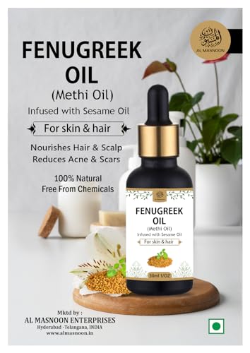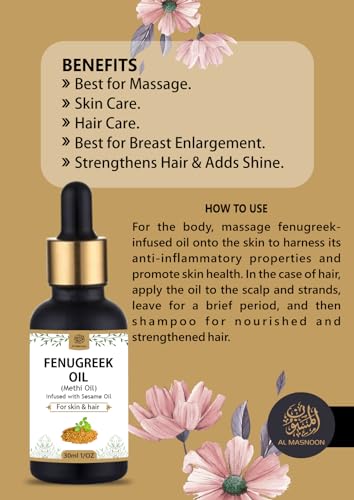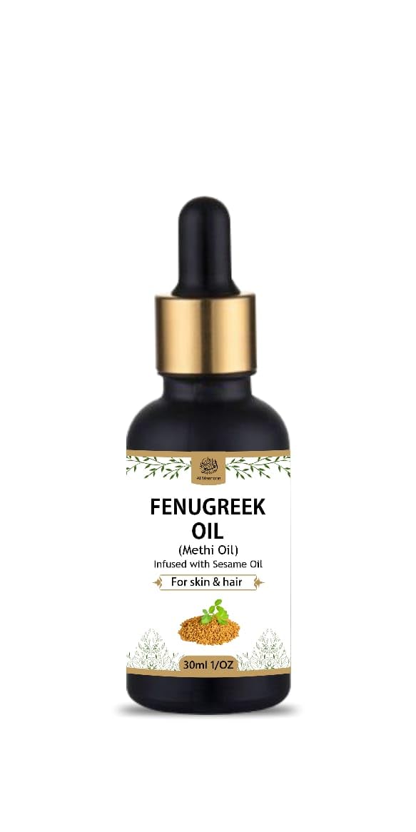 Al Masnoon Fenugreek Oil (Methi Oil) is a luxurious and effective beauty elixir designed to nourish and strengthen both hair and skin. Infused with the powerful benefits of fenugreek seeds and sesame oil this 100% pure and natural formula provides deep conditioning hydration and protection. Suitable for all skin and hair types this chemical-free oil helps to improve texture promote healthy growth and protect against environmental damage. Enjoy the soothing aroma and versatile benefits of Al Masnoon Fenugreek Oil and elevate your beauty routine with this nourishing and strengthening elixir.