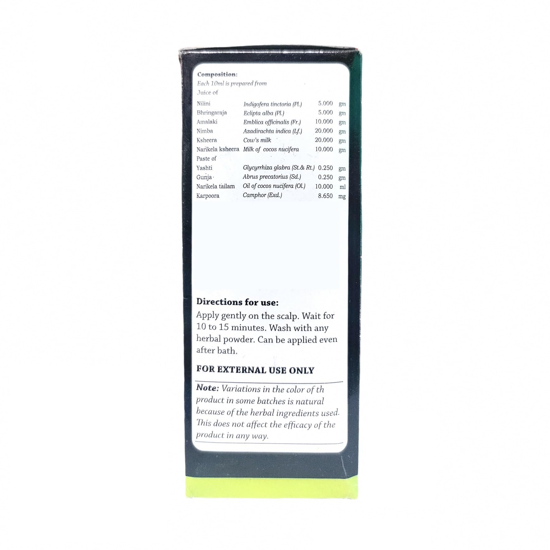 Directions for Use: Apply gently on the scalp. Wait for 10 to 15 minutes. Wash with any herbal powder. Can be applied even after a bath.