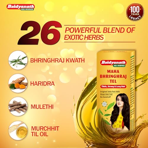 Say hello to thick strong & shiny hair with Baidyanath Mahabhringhraj Tel - the ultimate solution to a moisturizing hair treatment. Popularly known as Keshraj (king of hair) this powerful hair oil is packed with vitamins proteins antioxidants and nutrients like magnesium iron and Vitamin D. This time-tested classical Ayurvedic oil is prepared using the ancient Taila Pak process with a combination of 26 exotic herbs in pure Til Tel (sesame oil). This process helps extract the medicinal properties of all the herbs thus making the oil highly potent. Bhringhraj Kwath is one of the major ingredients that help strengthen your hair roots & keeps the hair healthy. Baidyanath Mahabhringhraj Tel helps reduce hairfall & fights dandruff. Immerse yourself in the natural essence of this oil to enhance your overall hair health & give it a youthful glow.