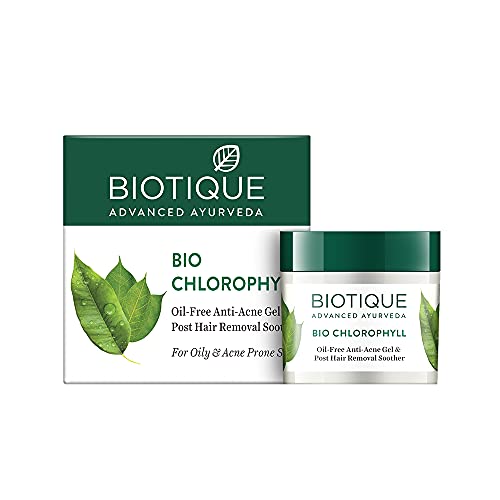 Product Description This refreshing anti-bacterial moisturizer is blended with chlorophyll and extracts of seaweed sea algae aloe vera and gum Arabic to tighten pores avert blemishes and keep skin nourished and clear without flaking. From the Manufacturer Acne is one of the biggest problems for a lot of people particularly for those with oily skin. Especially during summers the condition gets worse with the extreme heat and humidity. The oil glands become more active and the skin gets extremely oily and using a moisturiser becomes almost impossible as it makes the skin prone to extreme oiliness. But if you donât use anything on your skin to protect and nourish it it becomes lifeless with each passing day and the acne condition only worsens.Biotique oil-free anti-acne gel is a gel based moisturiser which is absolutely oil free and works wonders on acne prone skin. It comes with chlorophyll and extracts of seaweed sea algae aloe vera and gum arabic. All these ingredients help in the prevention of blemishes and soothe the skin. The skin doesnât feel tight and flaky. It feels smooth and is nourished from within.All the Biotique products are made with the combination of ayurvedic recipes and current era of science and biotechnology.Biotique Bio Chlorophyll anti-acne gel can be applied twice daily on absolutely cleansed face and neck for best results. You would be able to see the difference for yourself a few days after using the product. It can also be used after waxing or after removing hair from your skin to prevent any kind of irritation and redness.Product Features It can be used by both men and women. It is suitable for oily skin. It comes in a quantity of 65g. Key ingredients are chlorophyll extracts of seaweed sea algae aloe vera and gum arabic. It comes in a sturdy packaging and is travel friendly. It is dermatologically tested and is absolutely safe to use also organically pure and free from preservatives.