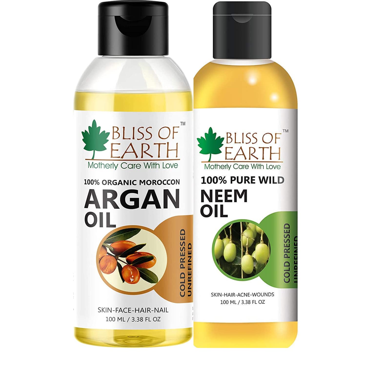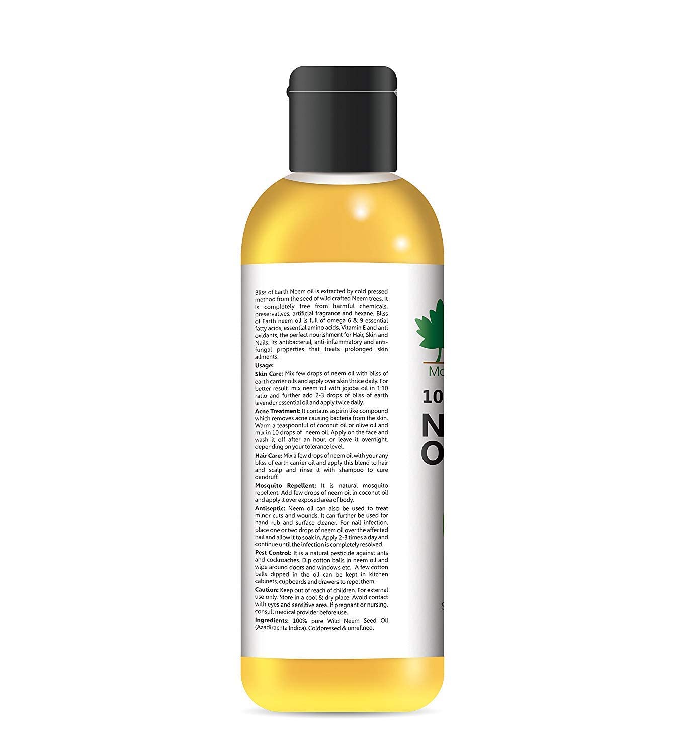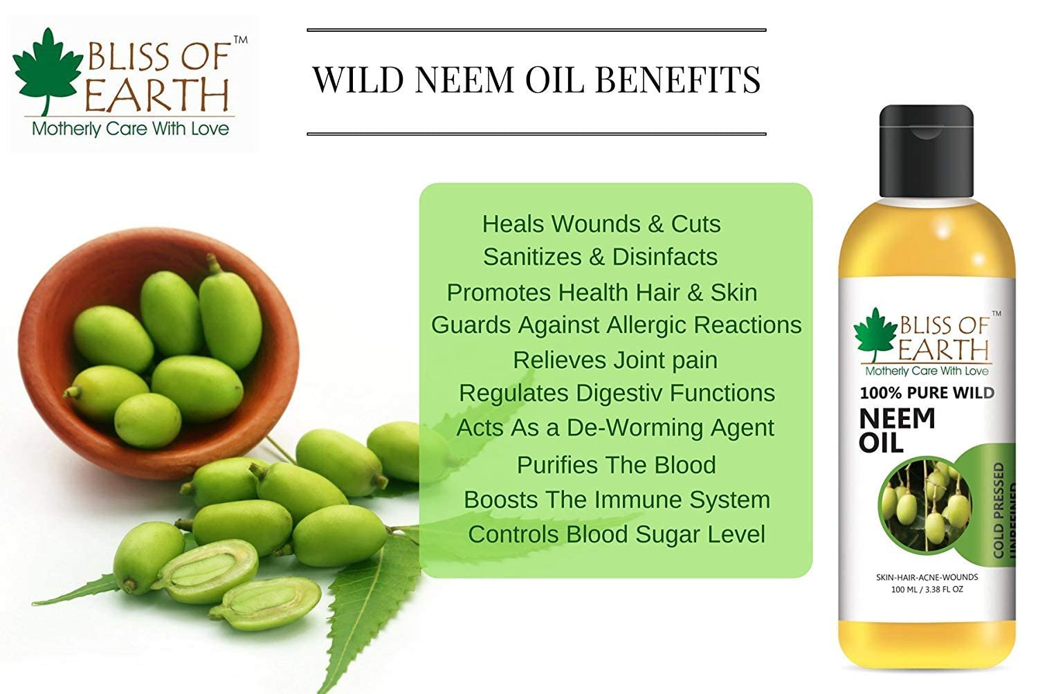 Earth is always referred as mother earth because of the pure and unconditional love & care it offers. It has a huge treasure of health & wellness essentials hidden in her belly. Whether its about being healthy or having beautiful skin and body mother earth has all. Bliss of earth bring out the products straight from the belly & offer them in their purest form. Bliss of earth offers the same motherly care & love through its 100% natural & organic products. Be it essential oils vegetable oils herbs & powders body butter or mineral clays you will get the same purity as mother earth has on offer. Try any of our products today and set yourself to experience the true bliss of mother earthNeem oil is extracted by cold pressed method from the seed of wild crafted Neem trees. It is completely free from harmful chemicals preservatives artificial fragrance and hexane. Bliss of Earth neem oil is full of omega 6 & 9 essential fatty acids essential amino acids Vitamin E and anti oxidants the perfect nourishment for Hair Skin and Nails. Its antibacterial anti-inflammatory and anti-fungal properties that treats prolonged skin ailments.