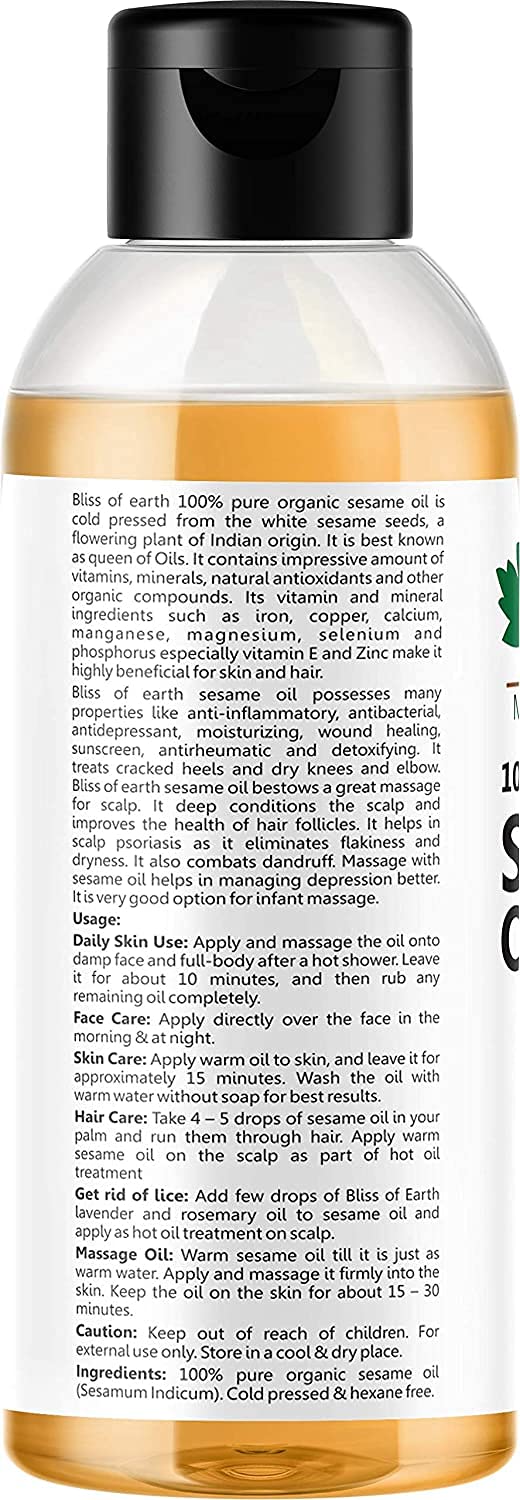 Earth is always referred as mother earth because of the pure and unconditional love & care it offers. It has a huge treasure of health & wellness essentials hidden in her belly. Whether its about being healthy or having beautiful skin and body mother earth has all. Bliss of earth bring out the products straight from the belly & offer them in their purest form. Bliss of earth offers the same motherly care & love through its 100% natural & organic products. Be it essential oils vegetable oils herbs & powders body butter or mineral clays you will get the same purity as mother earth has on offer. Try any of our products today and set yourself to experience the true bliss of mother earthorganic sesame oil 100ml. Cold pressed and unrefined- finest quality therapeutic grade oils - ideal for complete beauty regime bliss of earthy these oil has a fresh natural aroma which is relaxing restorative and refreshing. It's gives a relax feeling to your muscle and mind too and these oils help to keep your hair and skin healthy it's a complete combo for your body it's makes your body healthy and shiny sesame oil: Sesame oil is rich in natural vitamins a e and b antioxidants as well as essential fatty acids like linoleic acids stearic acids and palmitic acids that makes it effective for skin care and hair care. Regular massages may help to diminish the appearance of scars stretch marks wrinkles etc benefits: Bliss of earthy perfect inclusion for anti aging formulas because of its palmitoleic acid content these oil help to relax muscle aches it's makes you stress free and acts as insect repellent. It may help reduce wrinkles and brighten the complexion sesame oil is easily absorbed into the skin and helps skin to retain its moisture bleed-free it may be helpful to combat against acne eczema inflammation general redness and irritation of the skin.