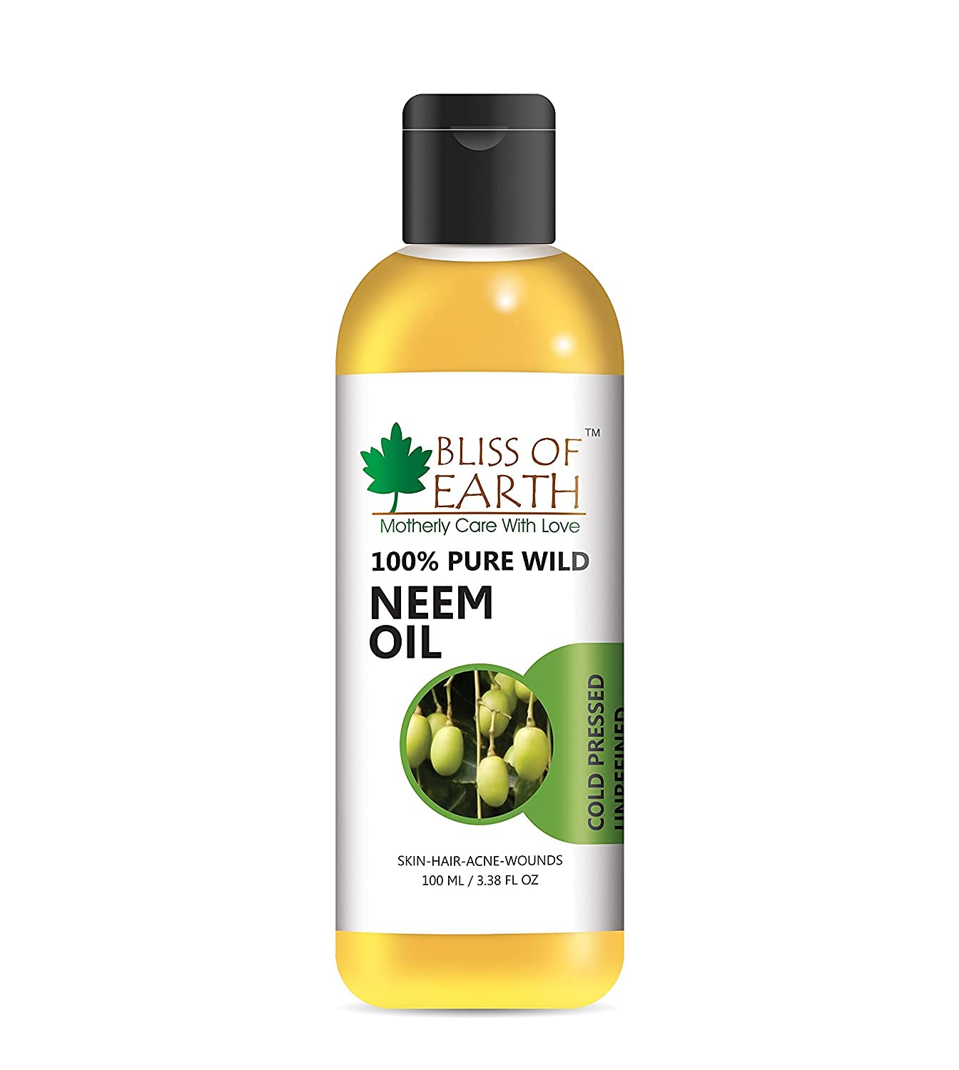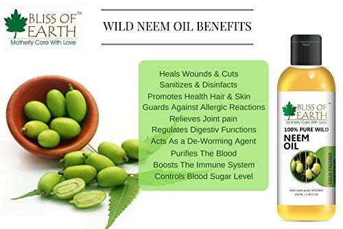 Bliss of Earth Neem oil is extracted by cold pressed method from the seed of wild crafted Neem trees. It is completely free from harmful chemicals preservatives artificial fragrance and hexane. Bliss of Earth neem oil is full of omega 6 & 9 essential fatty acids essential amino acids Vitamin E and anti oxidants the perfect nourishment for Hair Skin and Nails. Its antibacterial anti-inflammatory and anti-fungal properties that treats prolonged skin ailments.