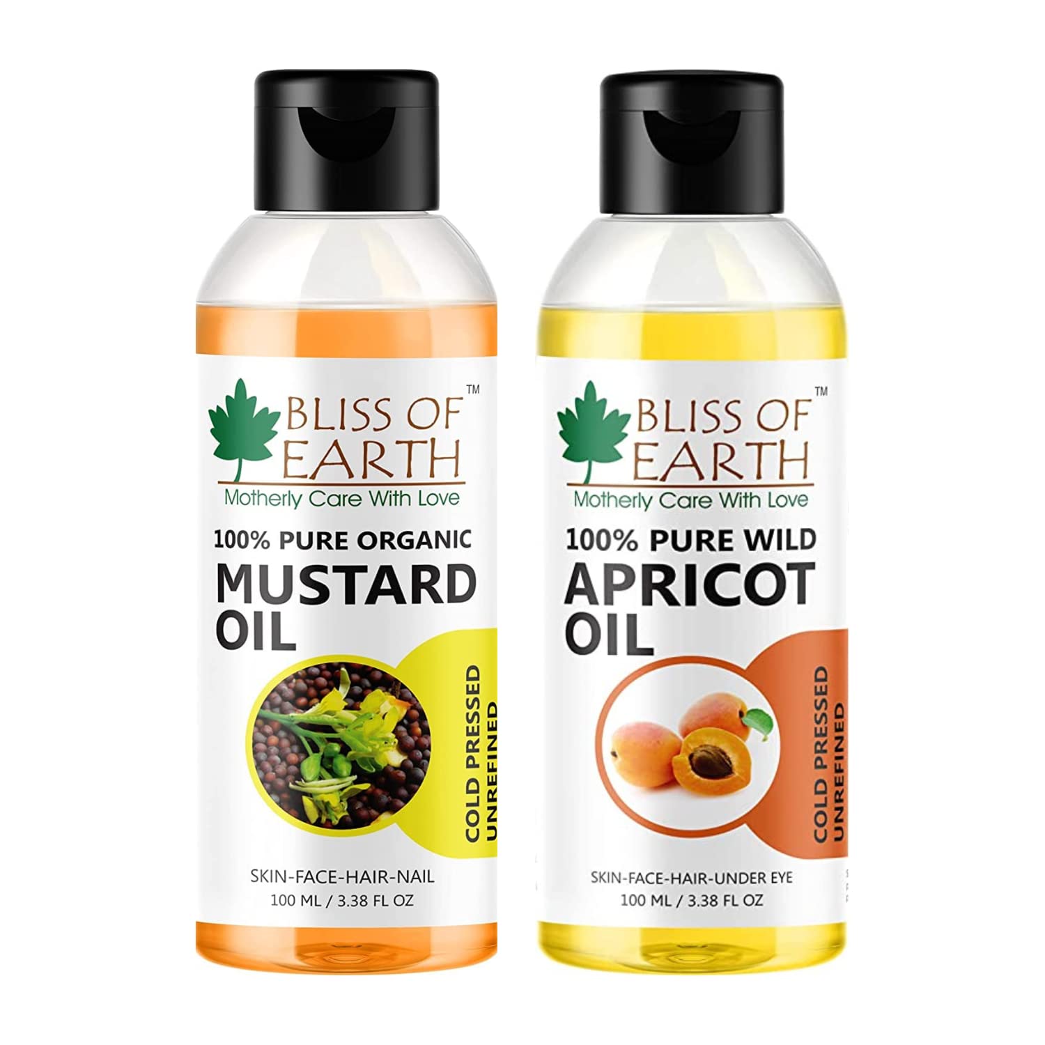Bliss of Earth organic mustard oil is premium quality pure 100% natural unrefined virgin cold pressed mustard seed oil. It is free from chemicals and preservatives and is rich in Vit A & E calcium alpha omega-3 and alpha omega -6 fatty acid and anti oxidants which makes it an excellent hair vitalizer anti tan. Its antifungal antibacterial anti-inflammatory along with its healing and medicinal property which are highly beneficial for hair skin and bodyBliss of Earth wild apricot kernel oil is coldpressed and extracted from the seeds of wild apricots handpicked from the higher reaches of Himalayan Forests. The oil is unrefined & unfiltered to retain all of its nutrients and healing benefits. Bliss of Earth wild apricot oil is rich in vitamin A B D & E including amino acids and essential fatty acids that are essential for keeping your skin looking younger and your hair looking healthier. Its regenerating properties helps treat sun damaged dry skin which in turn will help minimize fine lines and wrinkles. Bliss of Earth wild apricot kernel oil is an excellent emollient and possesses many therapeutic properties including anti-inflammatory anti-ageing anti-bacterial antiseptic and antioxidant.