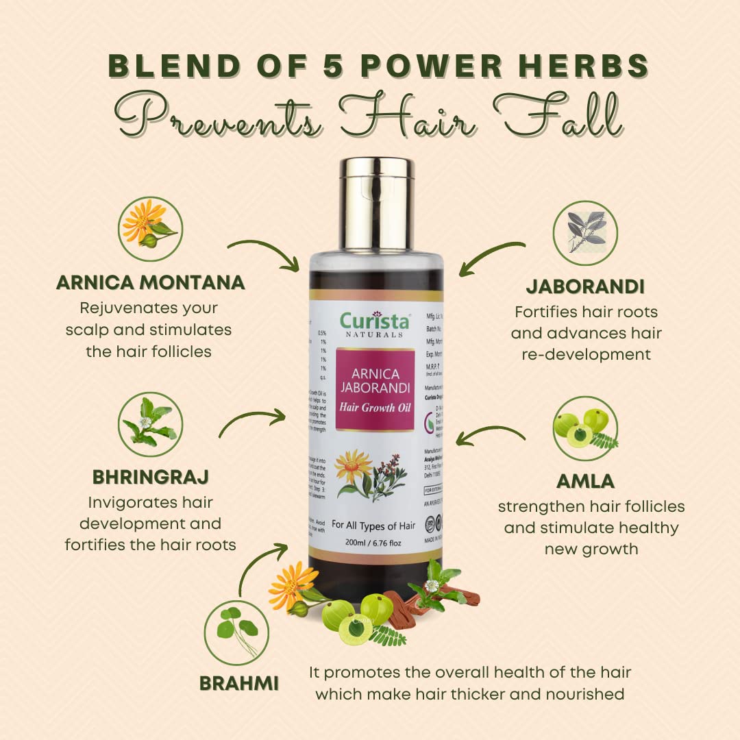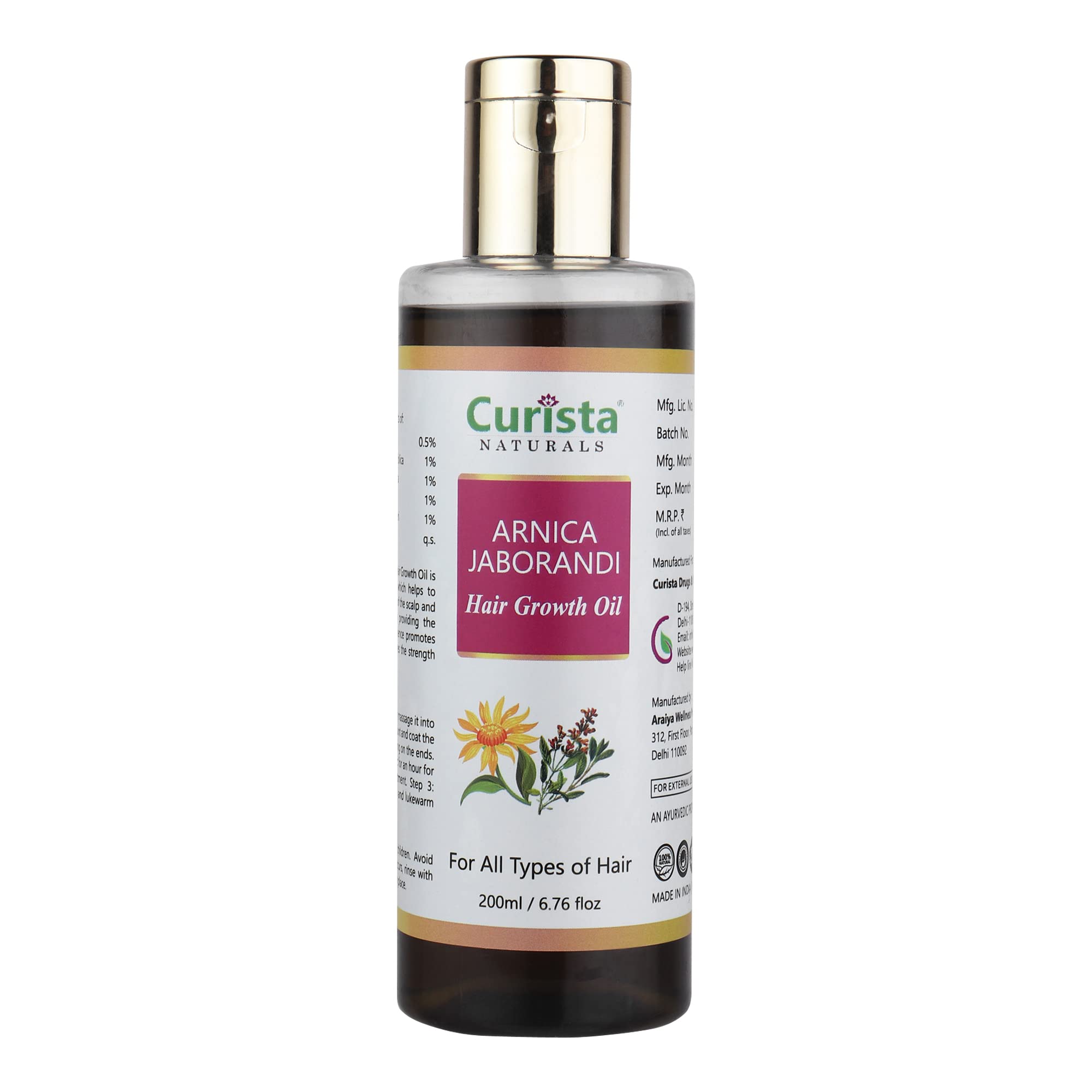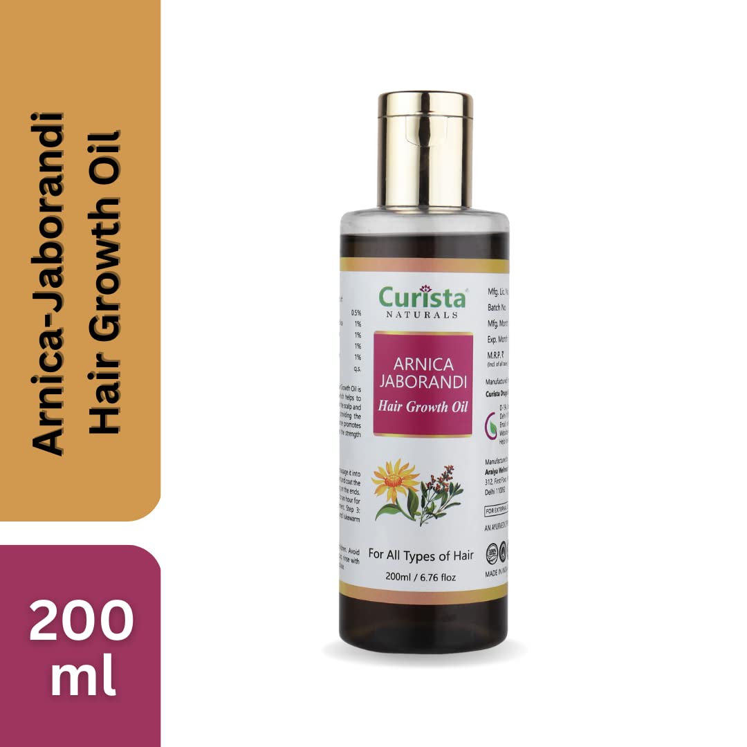 Curista Naturals Arnica Jaborandi Hair Growth Oil is clinically tested and 100% Ayurvedic Oil. It contains hair caring naturals herbs like Bhrigraj Arnica Jaborandi Amla and Brahmi. It help to reduce Hairfall and give life to the hair. It has 100% natural colour & fragrance.