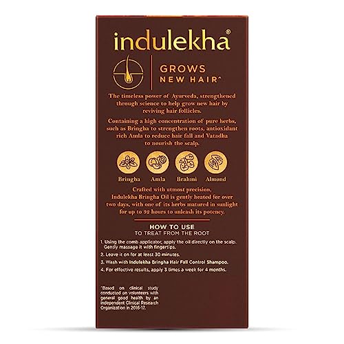Indulekha Bringha Oil is an Ayurvedic proprietary medicine recommended for the regulation of hair and scalp conditions like hairfall dandruff etc. The excellent action of Indulekha Bringha oil is due to the actions of its ingredients and the special manufacturing procedure of the base oil.During the production of Indulekha Bringha Oil the Swethakutaja leaves are dipped in pure coconut milk oil (prepared by cold process technology). This prolonged blending process helps to extract the entire medicinal quality of the leaves and thus makes it an effective ingredient of Indulekha Bringha Oil.Active ingredients along with the base oil create an excellent combination that is extremely beneficial for hair. Aloe vera contains enzymes which repairs dead skin cells on the scalp. It promotes hair growth prevents itching on the scalp reduces dandruff and conditions your hair. it rejuvenates the hair with its own nutrients giving it more elasticity and preventing breakage. Neem helps to treat these conditions of hair and cleanse the scalp for healthy hair growth. Bringharaj helps to improve hair growth and colour. Its extracts rejuvenates hair keeping the hair lustrous dark and healthy. It also helps to nurture and condition hair. Amla is the richest source of Vitamin C. It helps maintain youthful hair color and retards premature graying and supports the strength of the hair follicles. Virgin coconut oil is extracted by the cold compression method. It is higher in vitamin content minerals fragrance and even the amount of protein