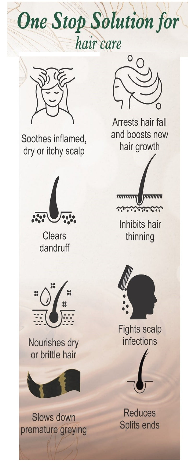 Cold Pressed Hemp Seed Oil (Cannabis Sativa), Virgin Coconut Oil (Cocos Nucifera), Linseed / Flaxseed Oil (Linum Usitatissimum), Safflower Oil (Carthamus Tinctorius), Neem Oil (Azadirachta Indica), Tocopheryl Acetate (Vitamin E), Black Caraway Seeds / Kalonji (Nigella Sativa), Fenugreek Seeds / Methi (Trigonella Foenum-Graecum), Sesame Seeds / Til (Sesamum Indicum), Curry Leaf (Murraya Koenigii), Triphala - Amalaki Fruit (Phyllanthus Emblica / Emblica Officinalis) & Haritaki Fruit (Terminalia Chebula) & Bibhitaki (Terminalia Bellirica), Japa Flower (Hibiscus Rosa-Sinensis), Bhringaraj whole plant (Eclipta Alba), Brahmi (Bacopa Monnieri), Jatamansi (Nardostachys Jatamansi), Manjistha root (Rubia Cordifolia), Liquorice Root / Mulethi (Glycyrrhiza Glabra), Nimba Leaf (Azadirachta Indica), Aloe Vera extract (Aloe Barbadensis). Infused with Lemongrass Oil. Light, Herbaceous & Refreshing. Application: Topically (For External Use only). Take required quantity and massage gently on the scalp. For better absorption, leave preferably overnight or wrap scalp with the hot towel, for thirty minutes. Wash and rinse or take three to five drops of oil on palm as per hair length and apply gently on hair until become silky & non-frizzy. Dont need to apply on scalp every time. Use daily for best results