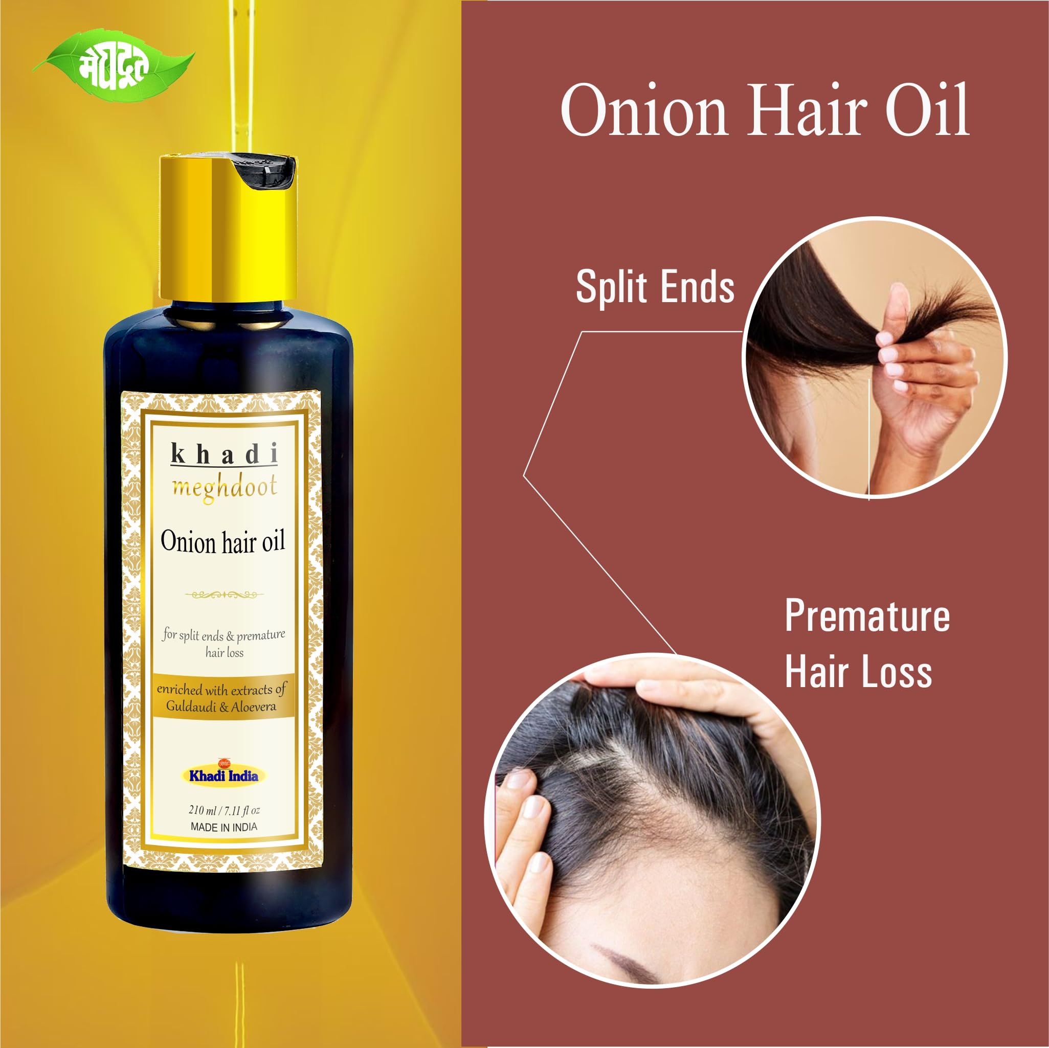 Khadi Meghdoot Onion Hair Oil is a potent blend of natural ingredients specifically designed to tackle split ends premature hair loss and promote overall hair health. Enriched with the power of onion extract this 100% Ayurvedic hair oil nourishes your scalp and strengthens hair follicles encouraging healthy growth and reducing hair thinning.Color-safe and always free of sulfates phosphates silicones and parabens. Touchable Softness & Shine - You (and they) won’t be able to help it. Silky Smooth Style - Tame flyaway’s and course stubborn hairs for a naturally smooth look. Subtle Seductive Natural Aroma - With Growth & Shine you can be confident in the light and subtly seductive Aroma of your hair no matter what the day or night has in store. ONION Hair Oil - For ALL TYPE OF HAIR - Ideal to Boost Hair Growth Anti Hair Fall Control & Removes Dandruff. Stop hair fall hair thinning healthy and dense hair with Khadi Meghdoot ONION Hair Oil.